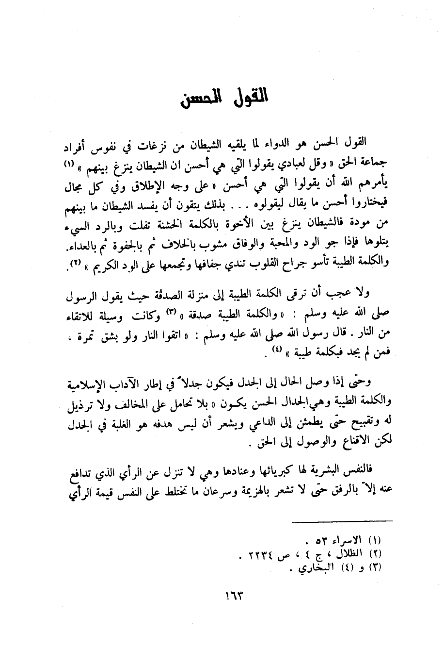 يامرهم الله ان يقولوا التي هي احسن على وجه الاطلاق وفي كل مجال فيختاروا احسن ما يقال ليقولوه ... بذلك يتقون ان يفسد الشيطان ما بينهم من مودة فالشيطان ينزغ بين الاخوة بالكلمة الخشنة تفلت وبالرد السيء يتلوها فاذا جو الود والمحبة والوفاق مشوب بالخلاف ثم بالجفوة ثم بالعداء. والكلمة الطيبة تأسو جراح القلوب تندي جفافها وتجمعها على الود الكريم"