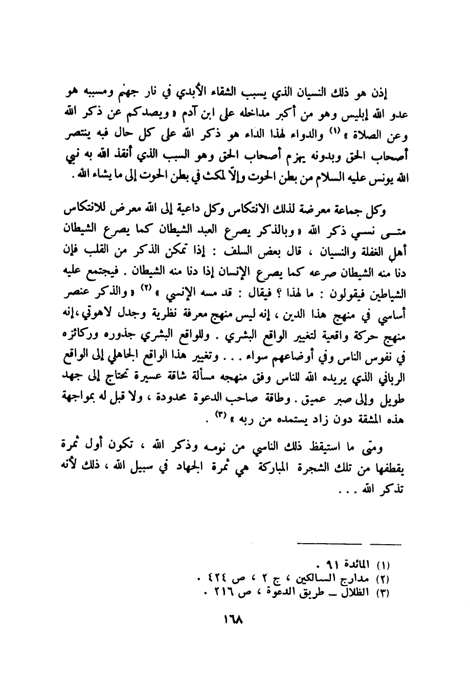 وكل جماعة معرضة لذلك الانتكاس وكل داعية الى الله معرض للانتكاس متى نسي ذكر الله وبالذكر يصرع العبد الشيطان كما يصرع الشيطان اهل الغفلة والنسيان. قال بعض السلف: اذا تمكن الذكر من القلب فان دنا منه الشيطان صرعه كما يصرع الانسان اذا دنا منه الشيطان فيجتمع عليه الشياطين فيقولون: ما لهذا؟ فيقال: قد مسه الانسي" والذكر عنصر اساسي في منهج هذا الدين انه ليس منهج معرفة نظرية وجدل لاهوتي انه منهج حركة واقعية لتغيير الواقع البشري. وللواقع البشري جذوره وركائزه في نفوس الناس وفي اوضاعهم سواء ...