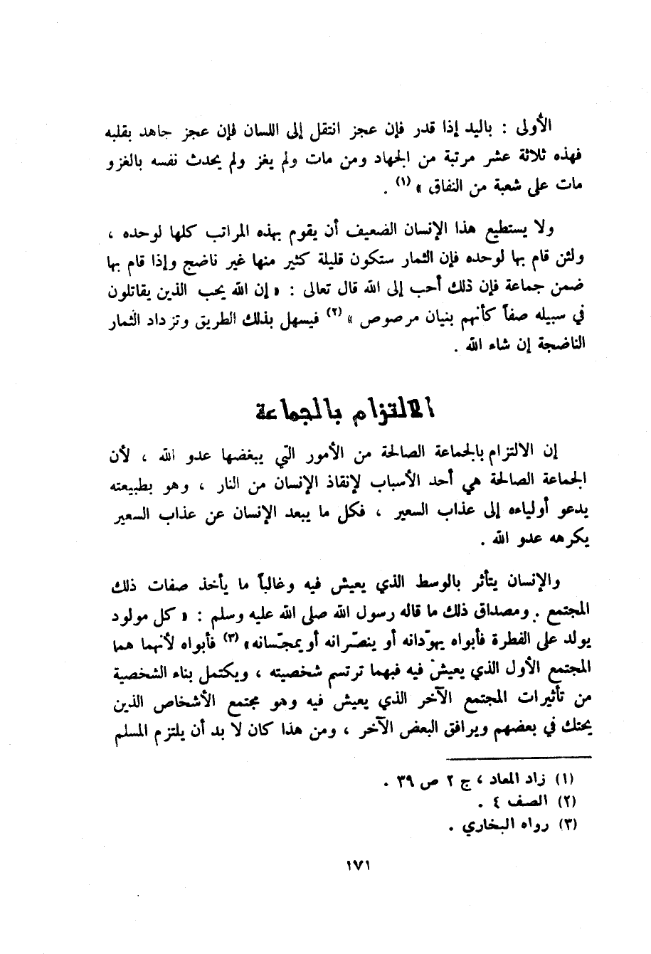 ولا يستطيع هذا الانسان الضعيف ان يقوم بهذه المراتب كلها لوحده ولئنقام بها لوحده فان الثمار ستكون قليلة كثير منها غير ناضج واذا قام بها ضمن جماعة فان ذلك احب الى الله قال تعالى:" ان الله يحب الذين يقاتلون في سبيله صفا كأنهم بنيان مرصوص" فيسهل بذلك الطريق وتزداد الثمار الناضجة ان شاء الله.