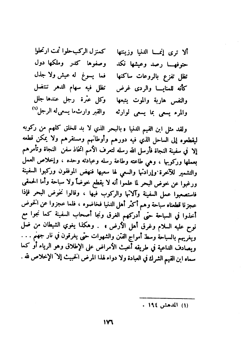 ولقد مثل ابن القيم الدنيا:" بالبحر الذي لا بد للخلق كلهم من ركوبه ليقطعوه الى الساحل الذي فيه دورهم واوطانهم ومستقرهم ولا يمكن قطعه الا في سفينة النجاة فأرسل الله رسله لتعرف الأمم اتخاذ سفن النجاة وتأمرهم بعملها وركوبها وهي طاعته وطاعة رسله وعبادته وحده واخلاص العمل والتشمير للاخرة وارادتها والسعي لها سعيها فنهض الموفقون وركبوا السفينة ورغبوا عن خوض البحر لما علموا انه لا يقطع خوضا ولا سباحة واما الحمقى فاستصعبوا عمل السفينة وآلاتها والركوب فيها وقالوا نخوض البحر فاذا عجزنا قطعناه سباحة وهم اكثر اهل الدنيا فخاضوه فلما عجزوا عن الخوض اخذوا في السباحة حتى ادركهم الغرق ونجا اصحاب السفينة كما نجوا مع نوح عليه السلام وغرق اهل الارض وهكذا يغوي الشيطان من ضل ويغريهم بالسباحة وسط امواج الفتن والشهوات حتى يغرقون في نار جهنم ...
