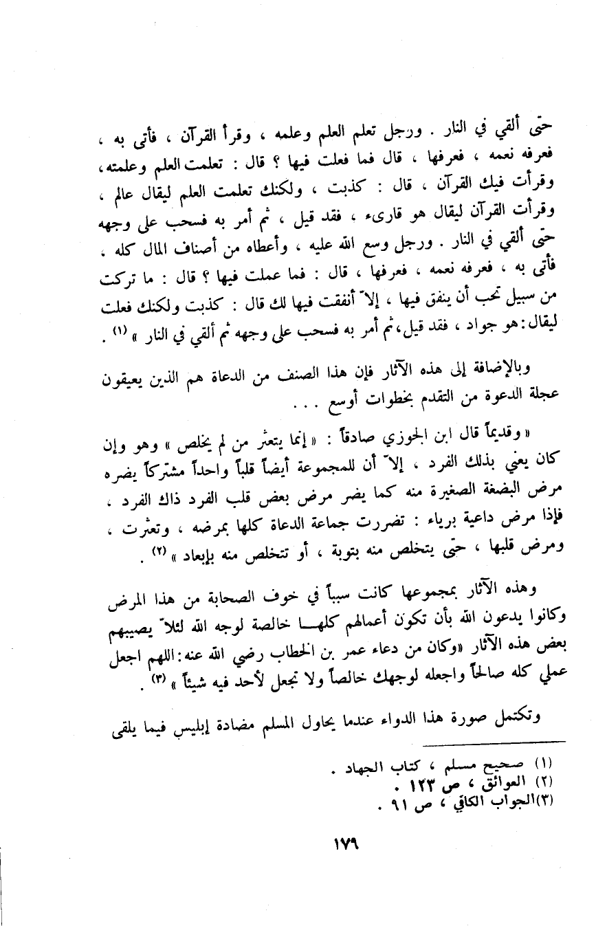 وقديما قال ابن الجوزي صادقا:" انما يتعثر من لم يخلص" وهو وان كان يعني بذلك الفرد الا ان للمجموعة ايضا قلبا واحدا مشتركا يضره مرض البضغة الصغيرة منه كما يضر مرض بغض قلب الفرد ذاك الفرد فاذا مرض داعية برياء تضررت جماعة الدعاة كلها بمرضه