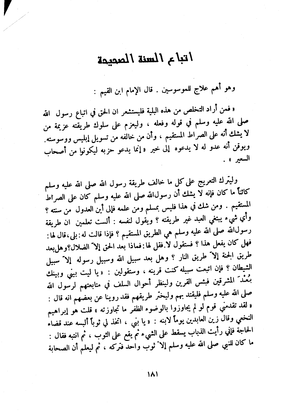 وليترك التعريج على كل ما خالف طريقة رسول الله صلى الله عليه وسلم كائنا ما كان فانه لا يشك ان رسول الله صلى الله عليه وسلم كان على الصراط المستقيم.