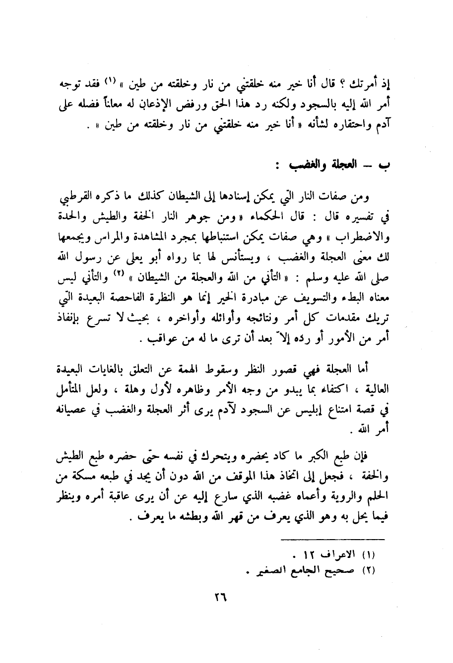 اما العجلة فهي قصور النظر وسقوط الهمة عن التعلق بالغايات البعيدة العالية اكتفاء بما يبدو من وجه الامر وظاهره لاول وهلة ولعل المتامل في قصة امتناع ابليس عن السجود لآدم يرى اثر العجلة والغضب في عصيانه امر الله.