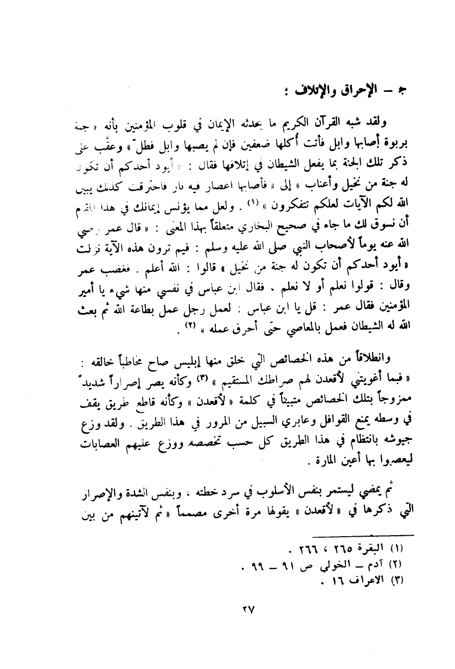 ولقد شبه القرآن الكريم ما يحدثه الايمان في قلوب المؤمنين بأنه " جنة بربوة اصابها وابل فأتت أكلها ضعفين فان لم يصبها وابل فطل" وعقب على ذكر تلك الجنة بما يفعل الشيطان في اتلافها فقال:" ايود احدكم ان تكون له جنة من نخيل واعناب" الى فاصابها اعصار فيه نار فاحترقت كذلك يبين الله لكم الآيات لعلكم تتفكرون" ولعل مما يؤنس ايمانك في هذا المقام ان نسوق لك ما جاء في صحيح البخاري متعلقا بهذا المعنى" قال عمر رضي الله عنه يوما لاصحاب النبي صلى الله عليه وسلم: فيما ترون هذه الآية نزلت