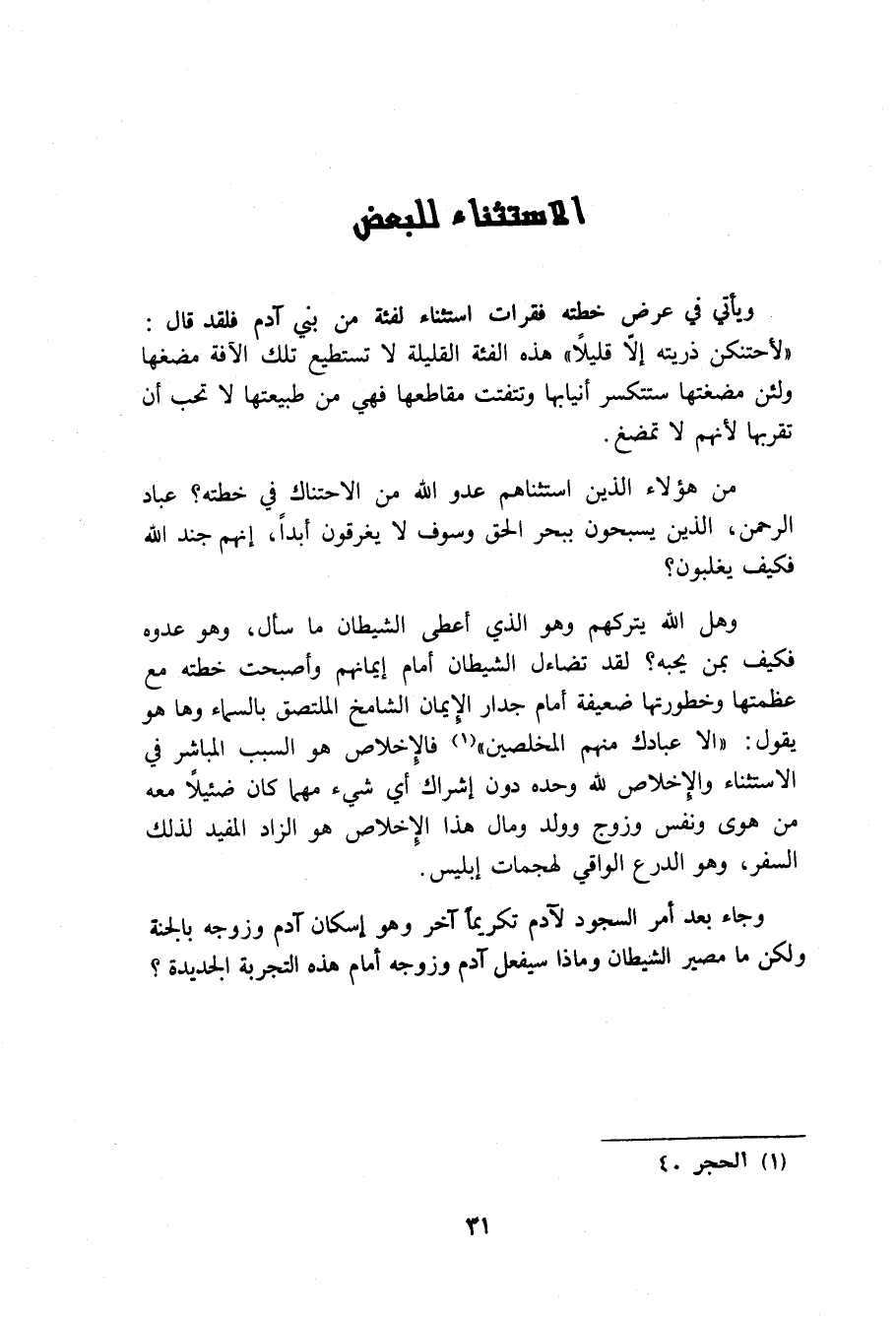 وياتي في عرض خطته فقرات استثناء لفئة من بني آدم فلقد قال:" لأحتنكن ذريته الا قليلا" هذه الفئة القليلة لا تستطيع تلك الآفة مضغها ولئن مضغتها ستتكسر انيابها وتتفتت مقاطعها فهي من طبيعتها لا تحب ان تقربها لأنهم لا تمضغ.