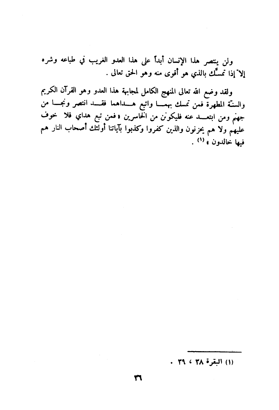 ولقد وضع الله تعالى المنهج الكامل لمجابهة هذا العدو وهو القرآن الكريم والسنة المطهرة فمن تمسك بهما واتبع هداهما فقد انتصر ونجا من جهنم ومن ابتعد عنه فليكونن من الخاسرين" فمن تبع هداي فلا خوف عليهم ولا هم يحزنون والذين كفروا وكذبوا بآياتنا اولئك اصحاب النار هم فيها خالدون".