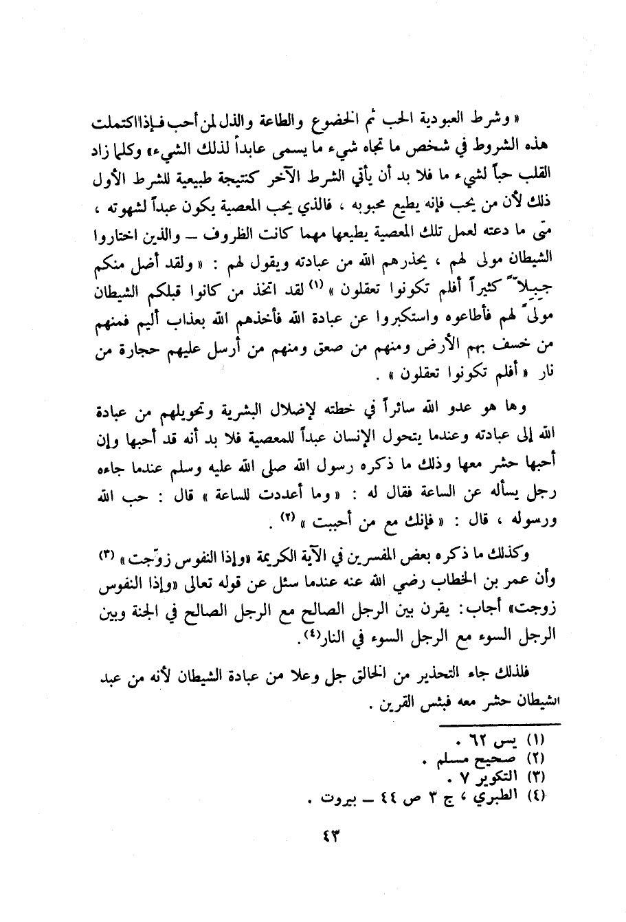 " وشرط العبودية الحب ثم الخضوع والطاعة والذل لمن احب فاذا اكتملت هذه الشروط في شخص ما تجاه شىء ما يسمى عابدا لذلك الشىء" وكلما زاد القلب حبا لشىء ما فلا بد ان ياتي الشرط الآخر كنتيجة طبيعية للشرط الاول ذلك لان من يحب فانه يطيع محبوبه فالذي يحب المعصية يكون عبدا لشهوته متى ما دعته لعمل تلك المعصية يطيعها مهما كانت الظروف - والذين اختاروا الشيطان مولى لهم يحذرهم الله من عبادته ويقول لهم