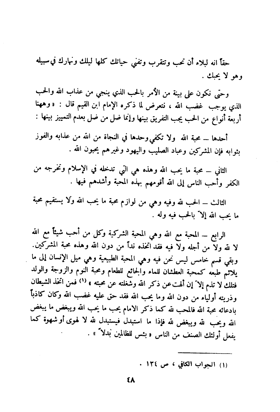 وحتى تكون على بينة من الامر بالحب الذي ينجي من عذاب الله والحب الذي يوجب غضب الله نتعرض لما ذكره الامام ابن القيم قال:" وههنا اربعة انواع من الحب يجب التفريق بينها وانما ضل من ضل بعدم التمييز بينها.