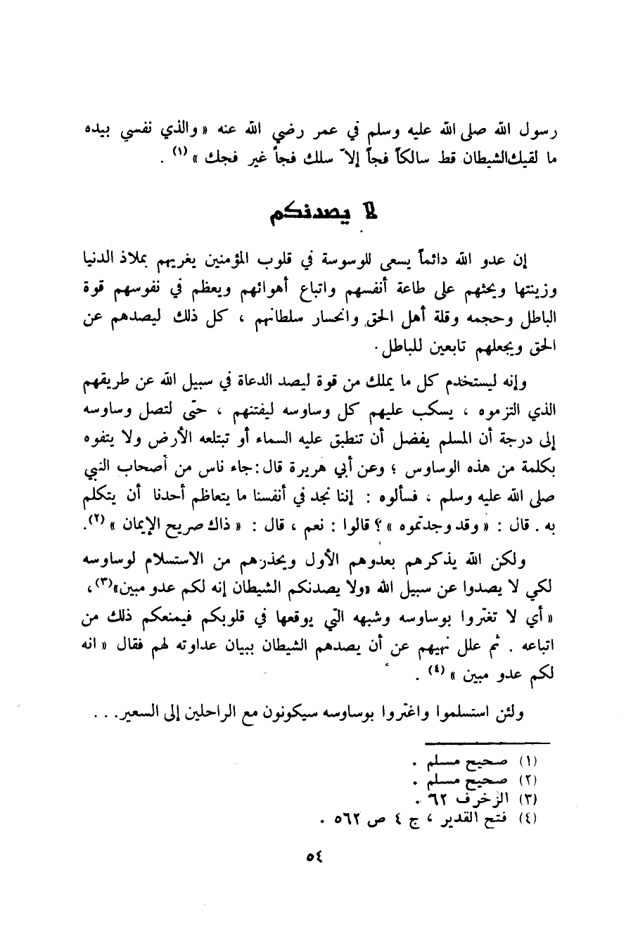 وانه ليستخدم كل ما يملك من قوة ليصد الدعاة في سبيل الله عن طريقهم الذي التزموه يسكب عليهم كل وساوسه ليفتنهم حتى لتصل وساوسه الى درجة ان المسلم يفضل ان تنطبق عليه السماء او تبتلعه الارض ولا يتفوه بكلمة من هذه الوساوس وعن ابي هريرة قال: جاء ناس من اصحاب النبي صلى الله عليه وسلم فسالوه اننا نجد في انفسنا ما يتعاظم احدنا ان يتكلم به قال وقد وجدتموه؟ قالوا نعم قال ذاك صريح الايمان