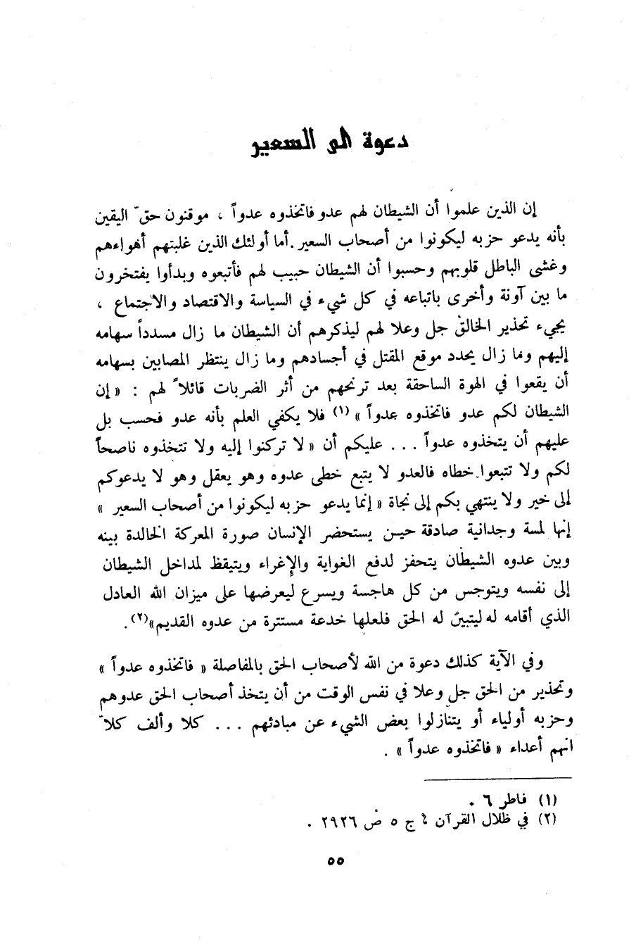 ان الذين علموا ان الشيطان لهم عدو فاتخذوه عدوا موقنون حق اليقين بانه يدعو حزبه ليكونوا من اصحاب السعير اما اولئك الذين غلبتهم اهواءهم وغشى الباطل قلوبهم وحسبوا ان الشيطان حبيب لهم فاتبعوه وبدأوا يفتخرون ما بين آونة وأخرى باتباعه في كل شىء في السياسة والاقتصاد والاجتماع يجىء تحذير الخالق جل وعلا لهم ليذكرهم ان الشيطان ما زال مسددا سهامه اليهم وما زال يحدد موقع المقتل في اجسادهم وما زال ينتظر المصابين بسهامه ان يقعوا في الهوة الساحقة بعد ان ترنحهم من اثر الضربات قائلا لهم:" ان الشيطان لكم عدوا فاتخذوه عدوا". فلا يكفي العلم بانه عدو فحسب بل عليهم ان يتخذوه عدوا ... عليكم ان لا تركنوا اليه ولا تتخذوه ناصحا لكم ولا تتبعوا خطاه فالعدو لا يتبع خطى عدوه وهو يعقل وهو لا يدعوكم الى خير ولا ينتهي بكم الى نجاة انما يدعو حزبه ليكونوا من اصحاب السعير انها لمسة وجدانية صادقة حين يستحضر الانسان صورة المعركة الخالدة بينه وبين عدوه الشيطان يتحفز لدفع الغواية والاعراء ويتيقظ لمداخل الشيطان الى نفسه ويتوجس من كل هاجسة ويسرع ليعرضها على ميزان الله العادل الذي اقامه له ليتبين له الحق فلعلها خدعة مستترة من عدوه القديم"