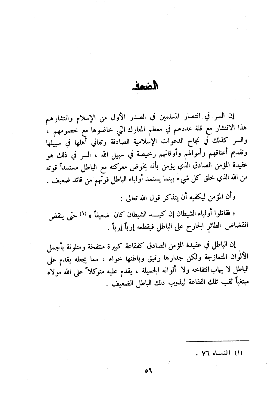 ان السر في انتصار المسلمين في الصدر الاول من الاسلام وانتشارهم هذا الانتشار مع قلة عددهم في معظم المعارك التي خاضوها مع خصومهم والسر كذلك في نجاح الدعوات الاسلامية الصادقة وتفاني اهلها في سبيلها وتقديم اعناقهم واموالهم واوقاتهم رخيصة في سبيل الله السر في ذلك هو عقيدة المؤمن الصادق الذي يؤمن بانه يخوض معركته مع الباطل مستمدا قوته من الله الذي خلق كل شىء بينما يستمد اولياء الباطل قوتهم من قائد ضعيف.