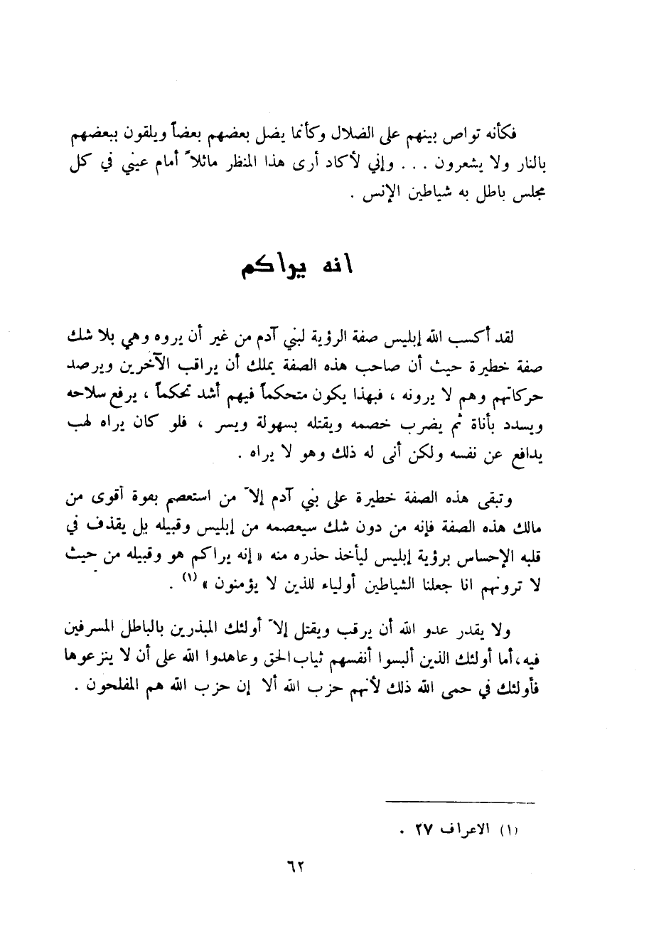 لقد أكسب الله ابليس صفة الرؤية لبني آدم من غير ان يروه وهي بلا شك صفة خطيرة حيث ان صاحب هذه الصفة يملك ان يراقب الآخرين ويرصد حركاتهم وهم لا يرونه فبهذا يكون متحكما فيهم اشد تحكما يرفع سلاحه ويسدد بأناة ثم يضرب خصمه ويقتله بسهولة ويسر فلو كان يراه لهب يدافع عن نفسه ولكن أنى له ذلك وهو لا يراه.