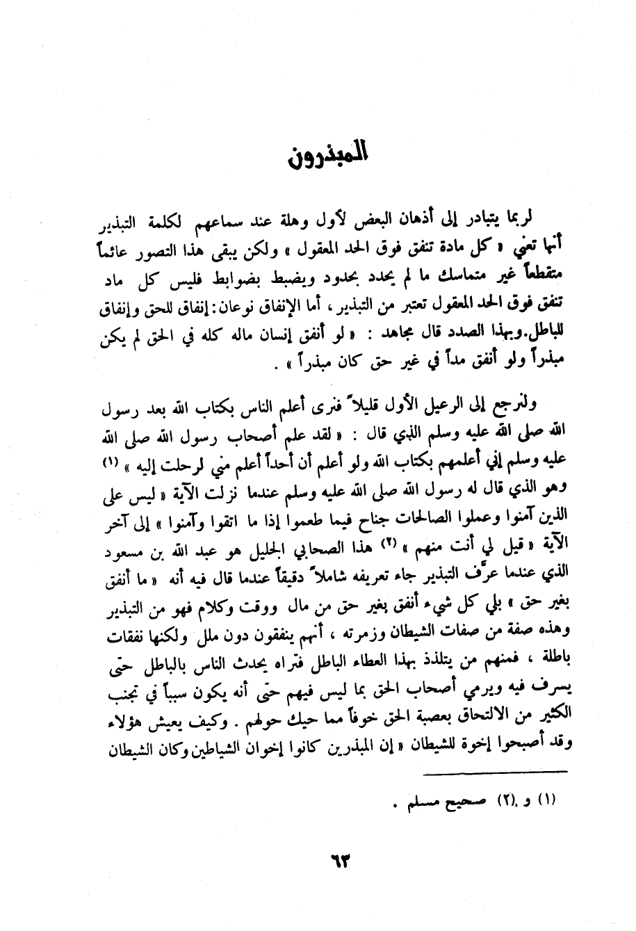 قيل لي انت منهم" هذا الصحابي الجليل هو عبد الله بن مسعود الذي عندما عرف التبذير جاء تعريفه شاملا دقيقا عندما قال فيه انه " ما انفق بغير حق" بلي كل شيء انفق بغير حق من مال ووقت وكلام فهو من التبذير وهذه صفة من صفات الشيطان وزمرته انهم ينفقون دون ملل ولكنها نفقات باطلة فمنهم من يتلذذ بهذا العطاء الباطل فتراه يحدث الناس بالباطل حتى يسرف فيه ويرمي اصحاب الحق بما ليس فيهم حتى انه يكون سببا في تجنب الكثير من الالتحاق بعصبة الحق خوفا مما حيك حولهم. وكيف يعيش هؤلاء وقد اصبحوا اخوة للشيطان