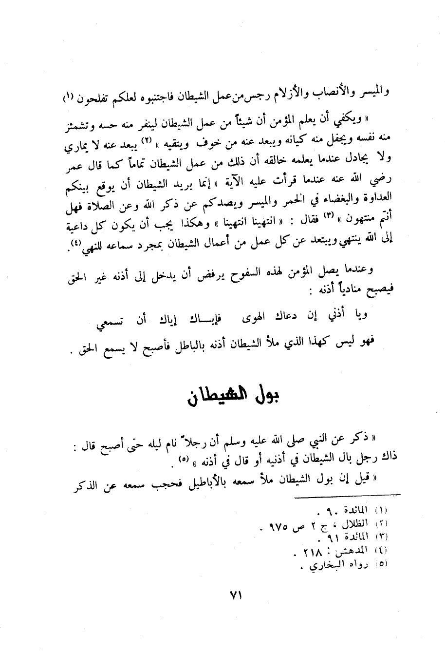 " ويكفي ان يعلم المؤمن ان شيئا من عمل الشيطان لينفر منه حسه وتشمئز منه نفسه ويجفل منه كيانه ويبعد عنه من خوف ويقيه " يبعد عنه لا يماري ولا يجادل عندما يعلمه خالقه ان ذلك من عمل الشيطان تماما كما قال عمر رضي الله عنه عندما قرأت عليه الآية انما يريد الشيطان ان يوقع بينكم العداوة والبغضاء في الخمر والميسر ويصدكم عن ذكر الله وعن الصلاة فهل انتم منتهون فقال:
