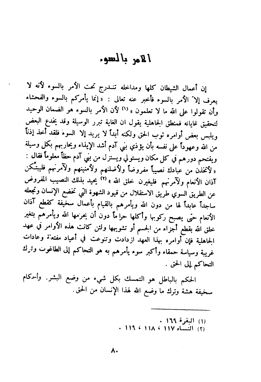 " انما يأمركم بالسوء والفحشاء وأن تقولوا على الله ما لا تعلمون ". لأن الأمر بالسوء هو الضمان الوحيد لتحقيق غاياته فمنطق الجاهلية يقول ان الغاية تبرر الوسيلة وقد يخدع البعض ويلبس بعض أوامره ثوب الحق ولكنه أبدا لا يريد الا السوء فلقد اخذ اذنا من الله وعهودا على نفسه بأن يؤذي بني آدم اشد الايذاء ويحاربهم بكل وسيلة ويقتحم دورهم في كل مكان ويستولي ويستنزل من بني آدم حظا معلوما فقال: