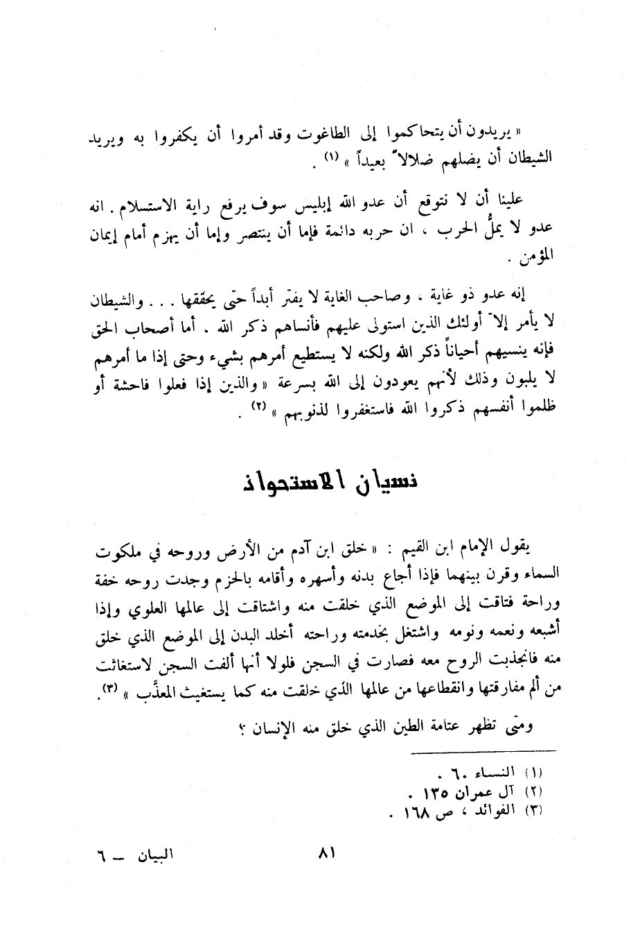 انه عدو ذو غاية. وصاحب الغاية لا يفتر ابدا حتى يحققهاوالشيطان لا يأمر الا اولئك الذين استولى عليهم فأنساهم ذكر الله. أما أصحاب الحق فانه ينسيهم أحيانا ذكر الله ولكنه لا يستطيع أمرهم بشيء وحتى اذا ما أمرهم لا يلبون وذلك لأنهم يعودون الى الله بسرعة