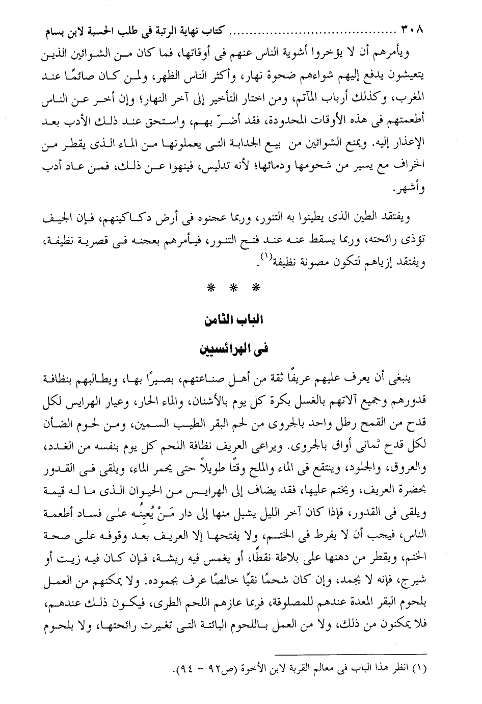 ينبغي أن يعرف عليهم عريفاً ثقة من أهل صناعتهم، بصيراً بها، ويطالبهم بنظافة قدورهم وجميع آلاتهم بالغسل بكرة كل يوم بالأشنان، والماء الحار، وعيار الهرايس لكل قدح من القمح رطل واحد بالجروى من لحم البقر الطيب السمين، ومن لحوم الضأن لكل قدح ثماني أواق بالجروى. ويراعى العريف نظافة اللحم كل يوم بنفسه من الغدد، والعروق، والجلود، وينتفع في الماء والملح وقتاً طويلاً حتى يحمر الماء، ويلقى في القدور بحضرة العريف، ويختم عليها، فقد يضاف إلى الهرايس من الحيوان الذي ما له قيمة ويلقى في القدور، فإذا كان آخر الليل يشيل منها إلى دار من يُعينُه على فساد أطعمة الناس، فيجب أن لا يفرط في الختم، ولا يفتحها إلا العريف بعد وقوفه على صحة الختم، ويقطر من دهنها على بلاطة نقطاً، أو يغمس فيه ريشة، فإن كان فيه زيت أو شيرج، فإنه لا يجمد، وإن كان شحماً نقياً خالصاً عرف بجموده. ولا يمكنهم من العمل بلحوم البقر المعدة عندهم للمصلوقة، فربما عازهم اللحم الطري، فيكون ذلك عندهم، فلا يمكنون من ذلك، ولا من العمل باللحوم البائتة التي تغيرت رائحتها، ولا بلحوم