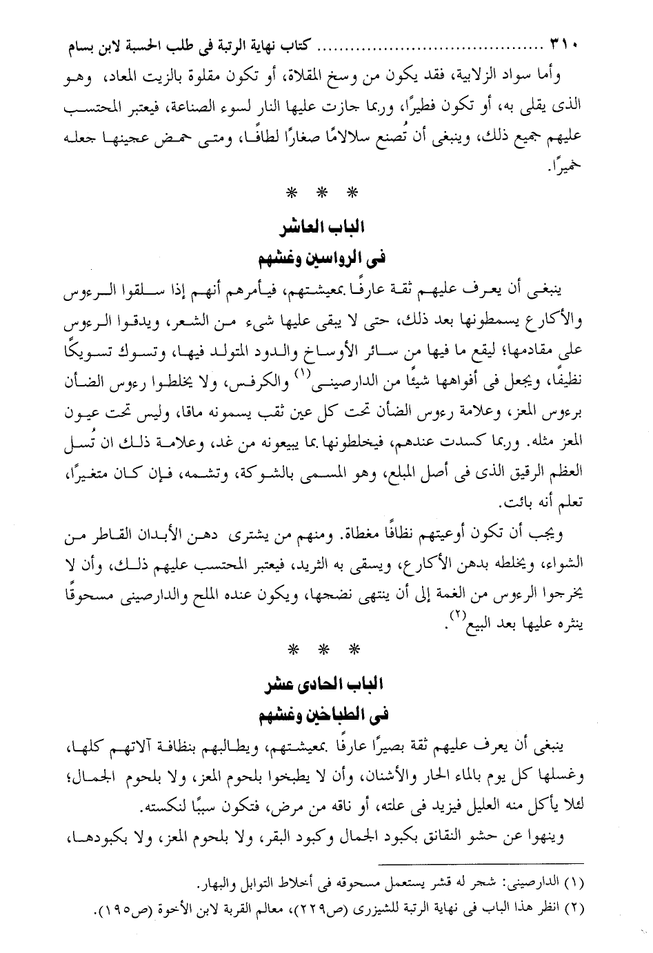 ينبغي أن يعرف عليهم ثقة عارفاً بمعيشتهم، فيأمرهم أنهم إذا سلقوا الرءوس والأكارع يسمطونها بعد ذلك، حتى لا يبقى عليها شيء من الشعر، ويدقوا الرءوس على مقادمها؛ ليقع ما فيها من سائر الأوساخ والدود المتولد فيها، وتسوك تسويكاً نظيفاً، ويجعل في أفواهها شيئاً من الدارصيني والكرفس، ولا يخلطوا رؤوس الضأن برؤوس المعز، وعلامة رؤوس الضأن تحت كل عين ثقب يسمونه ماقا، وليس تحت عيون المعز. وربما كسدت عندهم، فيخلطونها بما يبعيونه من غد، وعلامة ذلك أن تُسل العظم الرقيق الذي في أصل المبلغ، وهو المسمى بالشوكة، وتشمه، فإن كان متغيراً، تعلم أنه بائت.