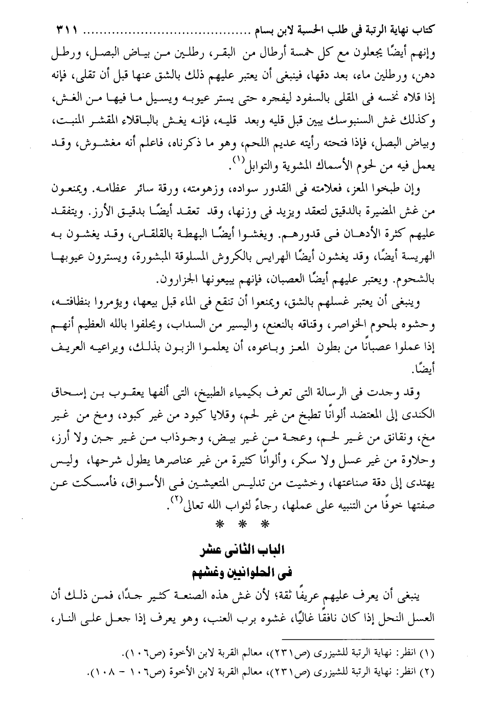 وإن طبخوا المعز، فعلامته في القدور سواده، وزهومته، ورقة سائر عظامه. ويمنعون من غش المضيرة بالدقيق لتعقد ويزيد في وزنها، وقد تعقد أيضاً بدقيق الأرز. ويتفقد عليهم كثرة الأدهان في قدورهم. ويغشوا أيضاً البهطة بالقلقاس، وقد يغشون به الهريسة أيضاً، وقد يغشون أيضاً الهرايس بالكروش المسلوقة المبشورة، ويسترون عيوبها بالشحوم. ويعتبر عليهم أيضاً العصبان، فإنهم يبيعونها الجزارون.