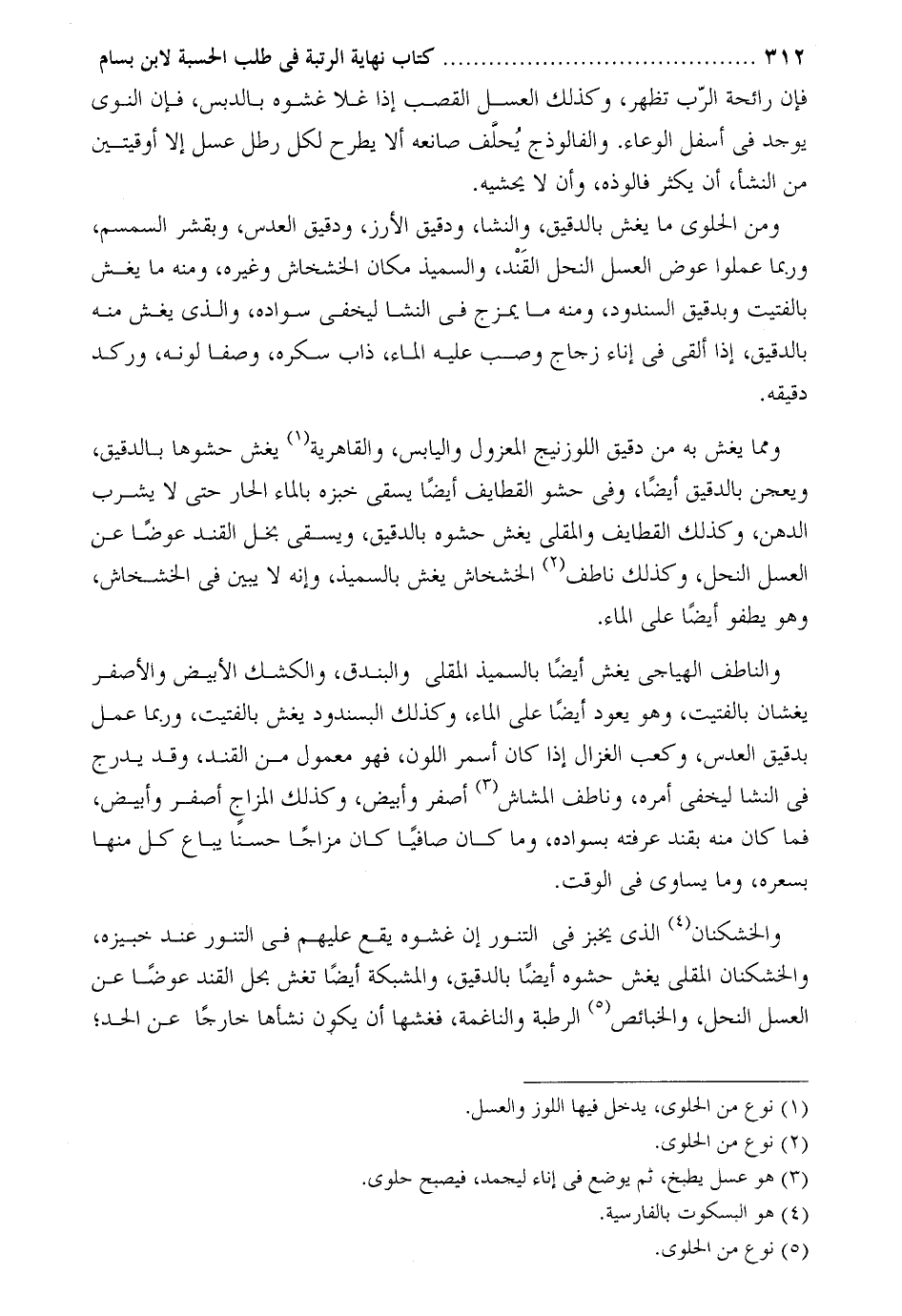 فإن رائحة الرب تظهر، وكذلك العسل القصب إذا غلا غشوة بالدبس، فإن النوى يوجد في أسفل الوعاء. والفالوذج يُحلف صانعه ألا يطرح لكل رطل عسل إلا أوقيتين من النشأ، أن يكثر فالوذه، وأن لا يحشيه.