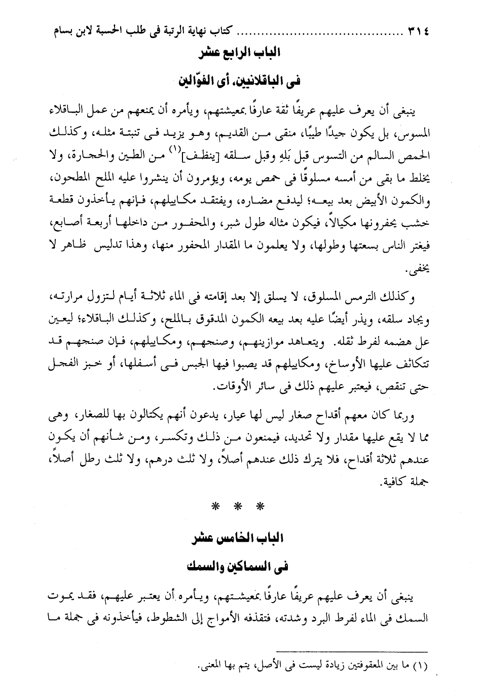 وكذلك الترمس المسلوق، لا يسلق إلا بعد إقامته في الماء ثلاثة أيام لتزول مرارته، ويجاد سلقه، ويذر أيضاً عليه بعد بيعه الكمون المدقوق بالملح، وكذلك الباقلاء؛ ليعين على هضمه لفرط ثقله. ويتعاهد موازينهم، وصنجهم، ومكاييلهم، فإن صنجهم قد تتكاثف عليها الأوساخ، ومكاييلهم قد يصبوا فيها الجبس في أسفلها، أو خبز الفجل حتى تنقص، فيعتبر عليهم ذلك في سائر الأوقات.