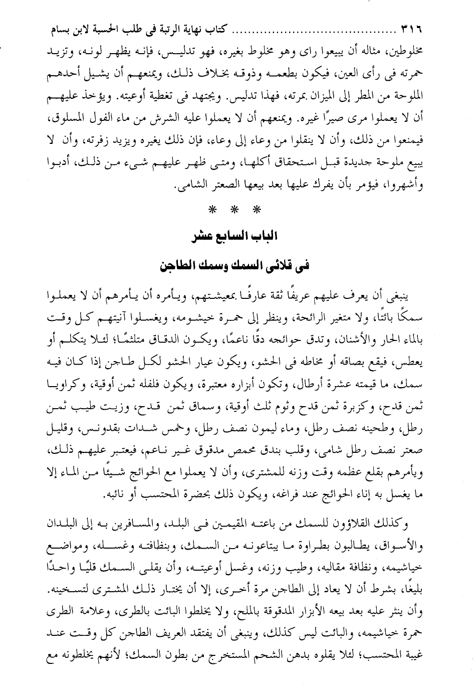 وكذلك القلاؤون للسمك من باعته المقيمين في البلد، والمسافرين به إلى البلدان والأسواق، يطالبون بطراوة ما يبتاعونه من السمك، وبنظافته وغسله، ومواضع خياشيمه، ونظافة مقاليه، وطيب وزنه، وغسل أوعيته، وأن يقلى السمك قلياً واحداً بليغاً، بشرط أن لا يعاد إلى الطاجن مرة أخرى، إلا أن يختار ذلك المشتري لتسخينه. وأن ينثر عليه بعد بيعه الأبزار المدقوقة بالملح، ولا يخلطوا البائت بالطري، وعلامة الطري حمرة خياشيمه، والبائت ليس كذلك، وينبغي أن يفتقد العريف الطاجن كل وقت عند غيبة المحتسب؛ لئلا يقلوه بدهن الشحم المستخرج من بطون السمك؛ لأنهم يخلطونه مع