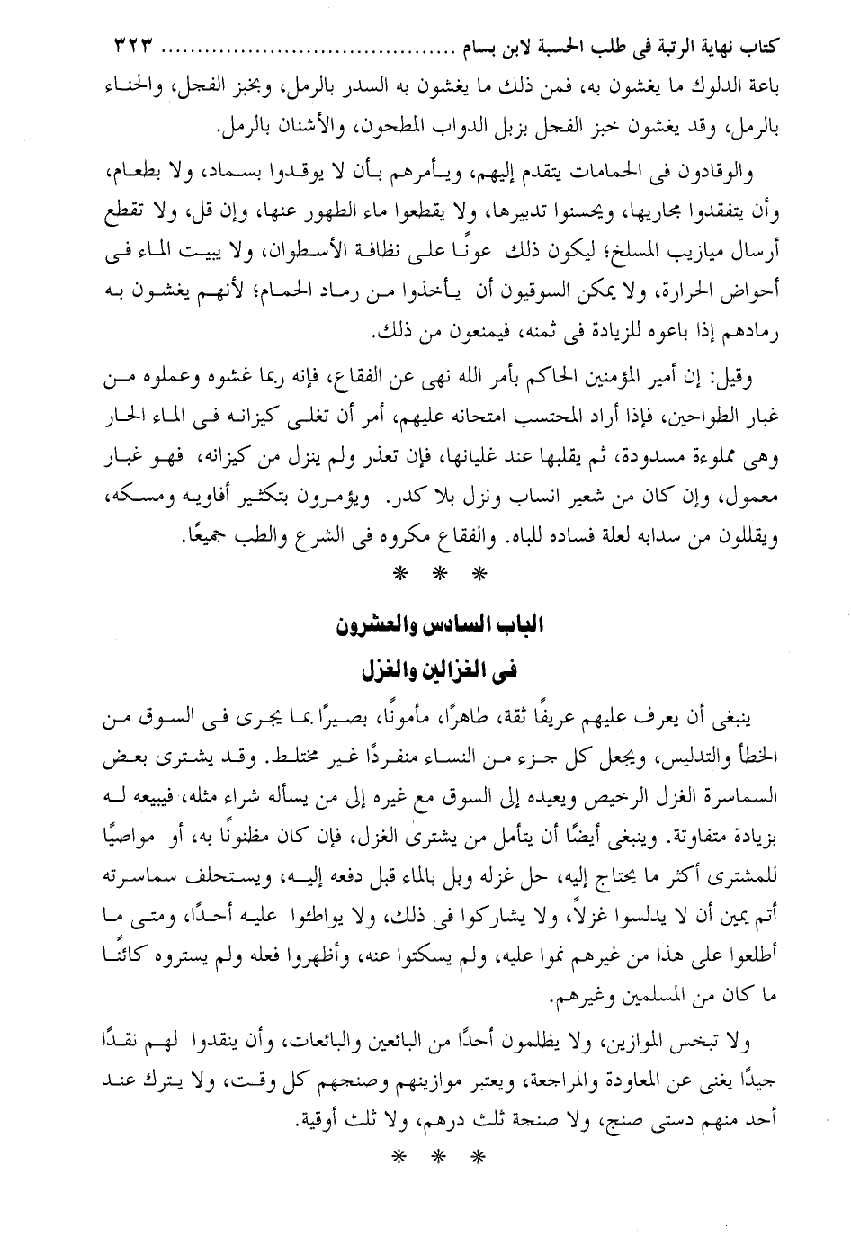 والوقادون في الحمامات يتقدم إليهم، ويأمرهم بأن لا يوقدوا بسماد، ولا بطعام، وأن يتفقدوا مجاريها، ويحسنوا تدبيرها، ولا يقطعوا ماء الطهور عنها، وإن قل، ولا تقطع إرسال ميازيب المسلخ؛ ليكون ذلك عوناً على نظافة الأسطوان، ولا يبيت الماء في أحواض الحرارة، ولا يمكن السوقيون أن يأخذوا من رماد الحمام؛ لأنهم يغشون به رمادهم إذا باعوه للزيادة في ثمنه، فيمنعون من ذلك.