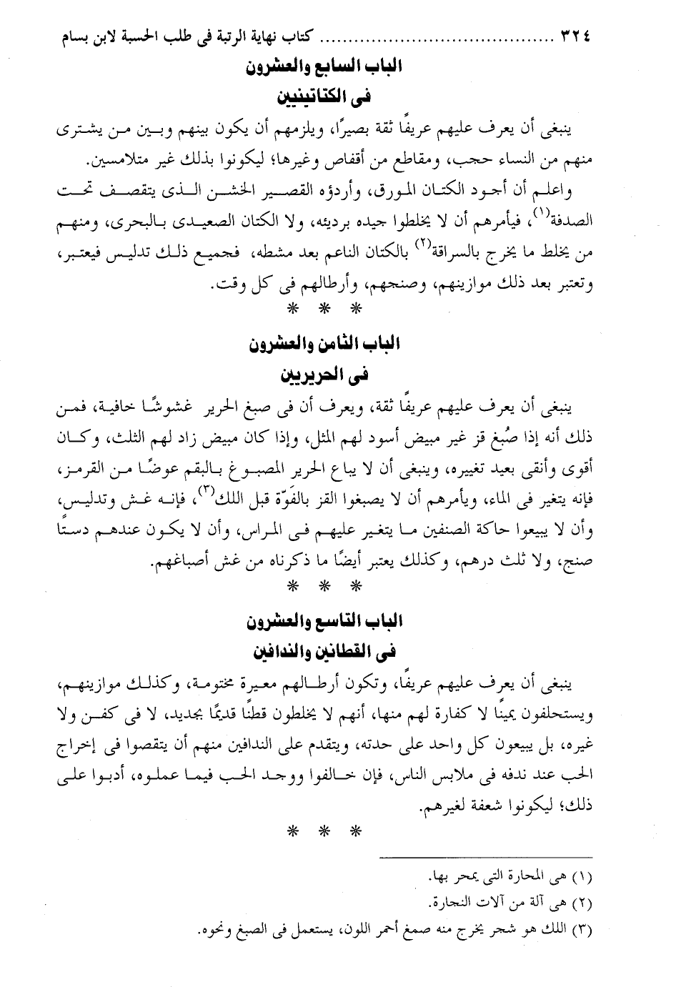 ينبغي أن يعرف عليهم عريفاً ثقة، ويعرف أن في صبغ الحرير غشوشاً خافية، فمن ذلك أنه إذا صُبغ قز غير مبيض أسود لهم المثل، وإذا كان مبيض زاد لهم الثلث، وكان أقوى وأنقى بعيد تغييره، وينبغي أن لا يباع الحرير المصبوغ بالبقم عوضاً من القرمز، فإنه يتغير في الماء، ويأمرهم أن لا يصبغوا القز بالفَوّة قبل اللك، فإنه غش وتدليس، وأن لا يبعوا حاكة الصنفين ما يتغير عليهم في المراس، وأن لا يكون عندهم دستاً صنج، ولا ثلث درهم، وكذلك يعتبر أيضاً ما ذكرناه من غش أصباغهم.