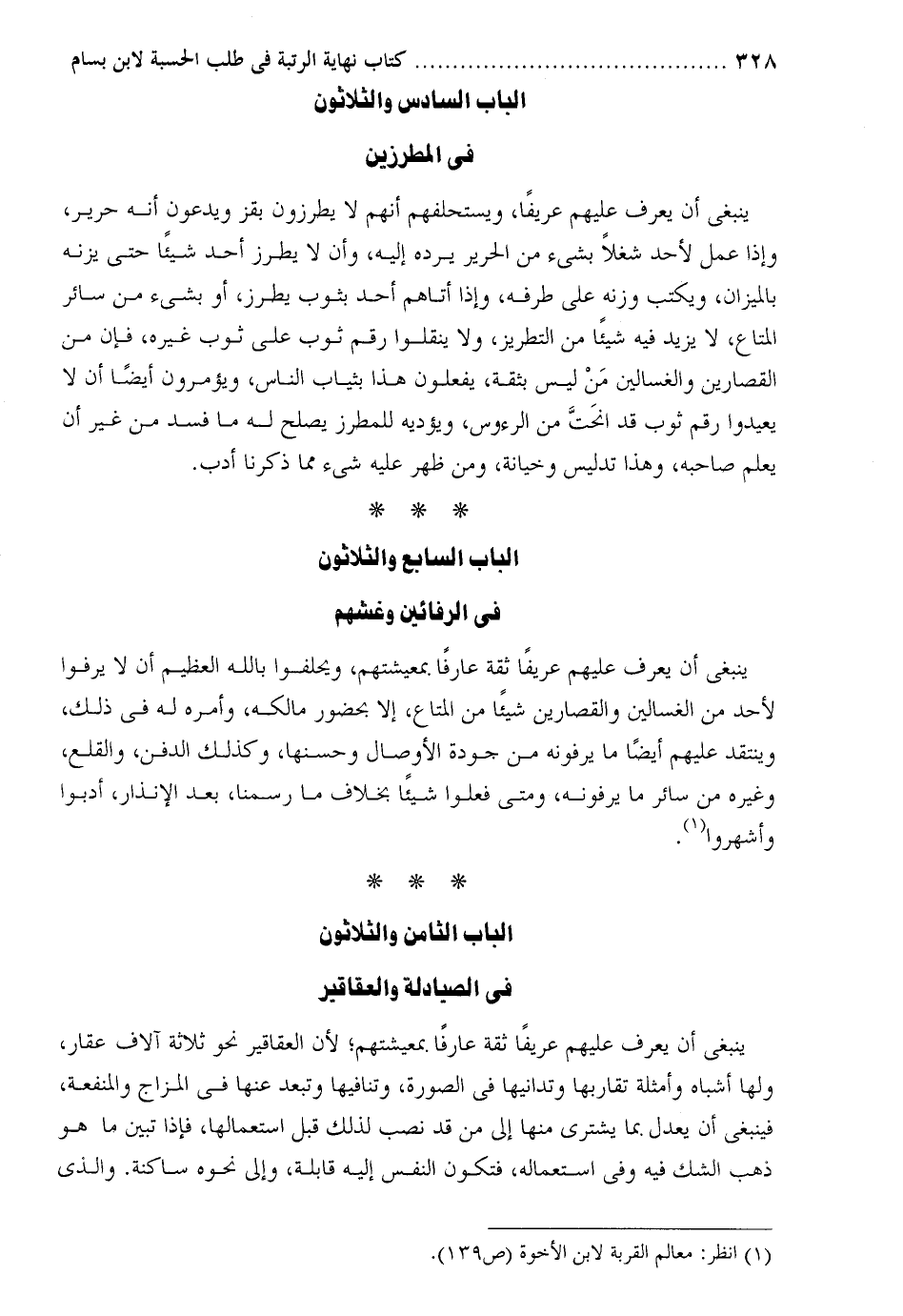 ينبغي أن يعرف عليهم عريفاً، ويستحلفهم أنهم لا يطرزون بقز ويدعون أنه حرير، وإذا عمل لأحد شغلاً بشيء من لا حرير يرده إليه، وأن لا يطرز أحد شيئاً حتى يزنه بالميزان، ويكتب وزنه على طرفه، وإذا أتاهم أحد بثوب يطرز، أو بشيء من سائر المتاع، لا يزيد فيه شيئاً من التطريز، ولا ينقلوا رقم ثوب على ثوب غيره، فإن من القصارين والغسالين من ليس بثقة، يفعلون هذا بثياب الناس، ويؤمرون أيضاً أن لا يعيدوا رقم ثوب قد انحتَّ من الرءوس، ويؤديه للمطرز يصلح له ما فسد من غير أن يعلم صاحبه، وهذا تدليس وخيانة، ومن ظهر عليه شيء مما ذكرنا أدب.