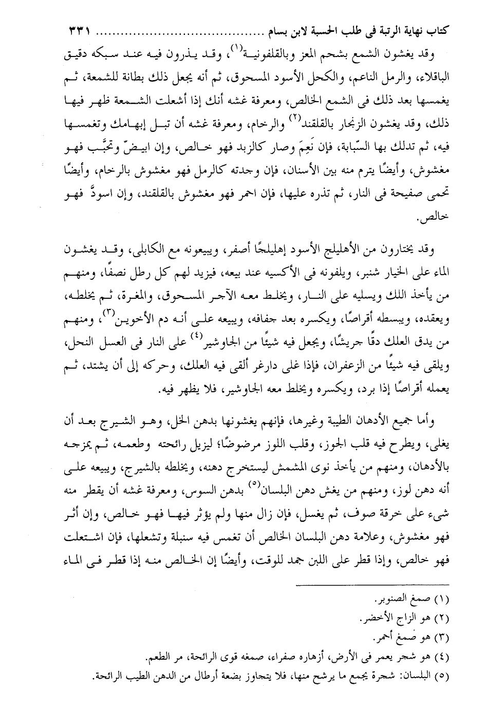 وأما جميع الأدهان الطيبة وغيرها، فإنهم يغشونها بدهن الخل، وهو الشيرج بعد أن يغلى، ويطرح فيه قلب الجوز، وقلب اللوز مرضوضاً؛ ليزيل رائحته وطعمه، ثم يمزجه بالأدهان، ومنهم من يأخذ نوى المشمش ليستخرج دهنه، ويخلطه بالشيرنج، ويبيعه على أنه دهن لوز، ومنهم من يغش دهن البلسان بدهن السوس، ومعرفة غشه أن يقطر منه شيء على خرقة صوف، ثم يغسل، فإن زال منها ولم يؤثر فيها فهو خالص، وإن أثر فهو مغشوش، وعلامة دهن البلسان الخالص أن نغمس فيه سنبلة وتشعلها، فإن اشتعلت فهو خالص، وإذا قطر على اللبن جمد للوقت، وأيضاً إن الخالص منه إذا قطر في الماء