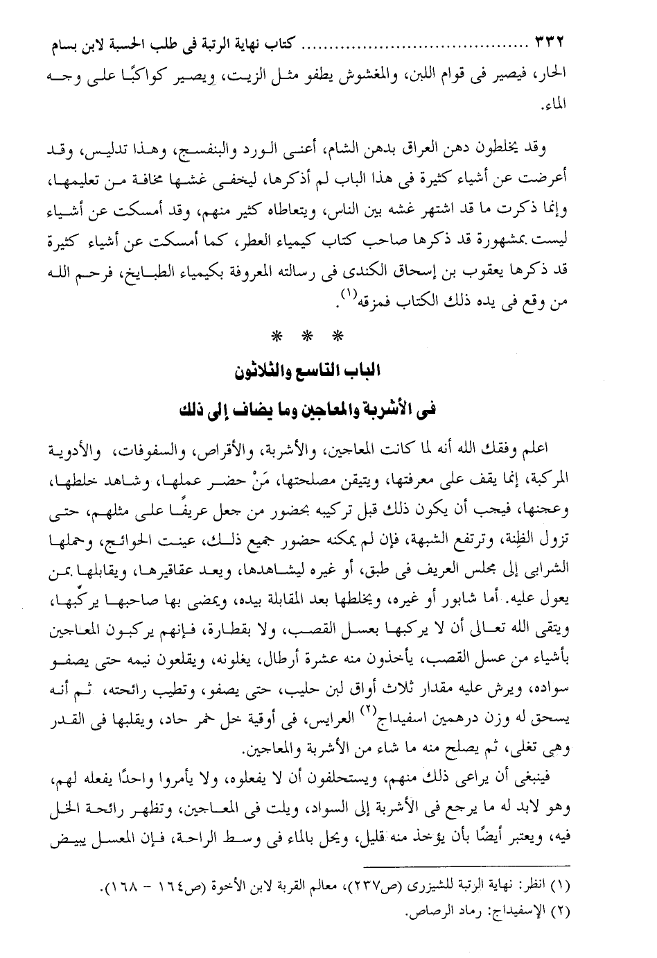 وقد يخلطون دهن العراق بدهن الشام، أعني الورد والبنفسج، وهذا تدليس، وقد أعرضت عن أشياء كثيرة في هذا الباب لم أذكرها، ليخفى غشها مخافة من تعليمها، وإنما ذكرت ما قد اهر غشه بين الناس، ويتعاطاه كثير منهم، وقد أمسكت عن أشياء ليست بمشهورة قد ذكرها صاحب كتاب كيمياء العطر، كما أمسكن عن أشياء كثيرة قد ذكرها يعقوب بن إسحاق الكندي في رسالته المعروفة بكيمياء الطبايخ، فرحم الله من وقع في يده ذلك الكتاب فمزقه.