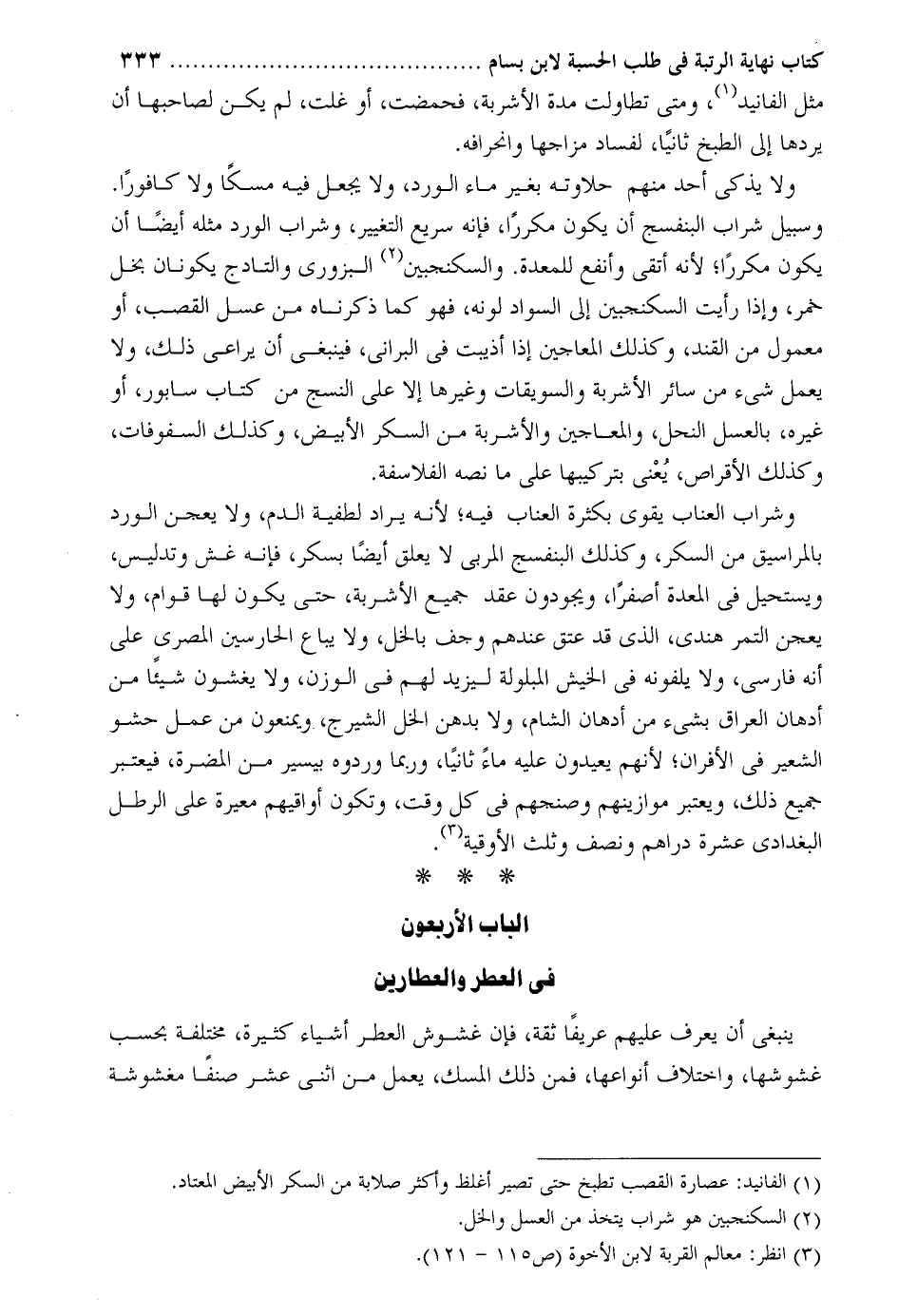 وشراب العناب يقوي بكثرة العناب فيه؛ لأنه يراد لطفية الدم، ولا يعجن الورد بالمراسيق من السكر، وكذلك البنفسج المربى لا يعلق أيضاً بسكر، فإنه غش وتدليس، ويستحيل في المعدة أسفراً، ويجودون عقد جميع الأشربة، حتى يكون لها قوام، ولا يعجن التمر هندي، الذي قد عتق عندهم وجف بالخل، ولا يباع الحارسين المصري على أنه فارسي، ولا يلفونه في الخيش المبلولة ليزيد لهم في الوزن، ولا يغشون شيئاً من أدهان العراق بشيء من أدهان الشام، ولا بدهن الخل الشيرج، ويمنعون من عمل حشو الشعير في الأفراد؛ لأنهم يعيدون عليه ماءً ثانياً، وربما وردوه بيسير من المضرة، فيعتبر جميع ذلك، ويعتبر موزينهم وصنجهم في كل وقت، وتكون أواقيهم معيرة على الرطل البغدادي عشرة دراهم ونصف وثلث الأوقية.