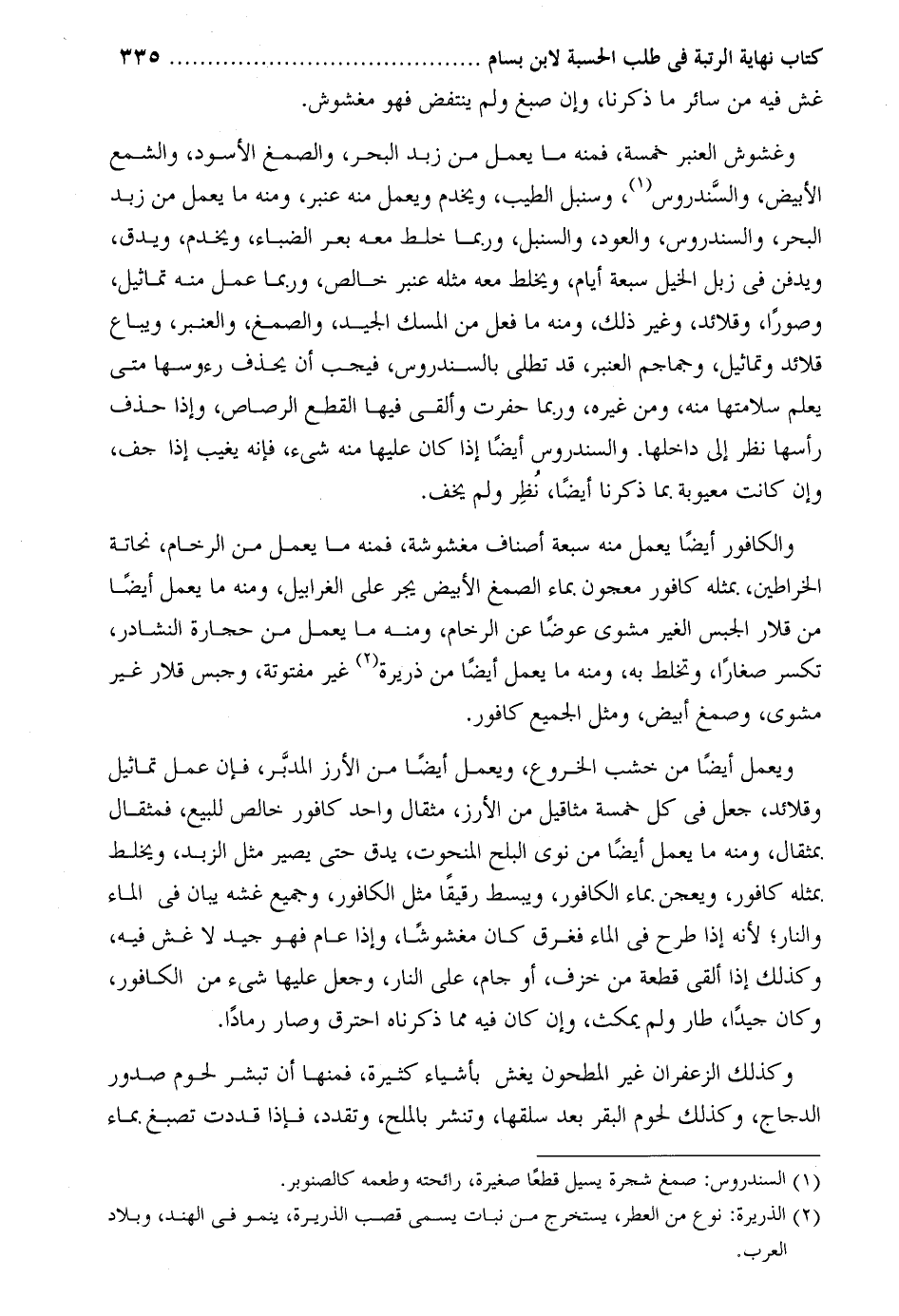 وغشوش العنبر خمسة، فمنه ما يعمل منه زبد البحر، والصمغ الأسود، والشمع الأبيض، والسنروس، وسنبل الطيب، ويخدم ويعمل منه عنبر، ومنه ما يعمل من زبد البحر، والسندروس، والعود، والسنبل، وربما خلط معه بعر الضباء، ويخدم، ويدق ويدفن في زبل الخيل سبعة أيام، ويخلط معه مثله عنبر خالص، وربما عمل منه تماثيل، وصوراً، وقلائد، وغير ذلك، ومنه ما فعل من المسك الجيد، والصمغ، والعنبر، ويباع قلائد وتماثيل، وجماجم العنبر، قد تطلى بالسندروس، فيجب أن يحذف رءوسها متى يعلم سلامتها منه، ومن غيره، وربما حفرت وألقي فيها القطع الرصاص، وإذا حذف رأسها نظر إلى داخلها. والسندروس أيضاً إذا كان عليها منه شيء، فإن يغيب إذا جف، وإن كانت معيوبة بما ذكرنا أيضاً، نُظر ولم يخف.