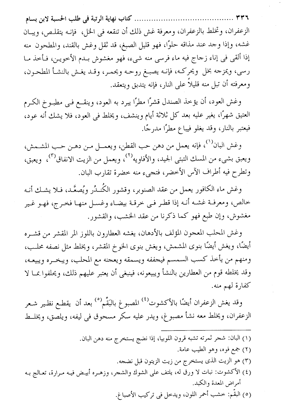 وغش المحلب المعجون المؤلف بالأدهان، يغشه العطارون باللوز المر المقشر من قشره أيضاً، ويغش أيضاً بنوى المشمش، ويغش بنوى الخوخ المقشر، ويخلط مثل نصفه محلب، ومنهم من يأخذ كسب السمسم فيجففه ويسمقه ويعجنه مع المحلب، ويبخره ويبيعه، وقد يخلطه قوم من العطارين بالنشأ ويبيعونه، فينبغي أن يعتبر عليهم ذلك، ويحلفوا بما لا كفارة لهم منه.