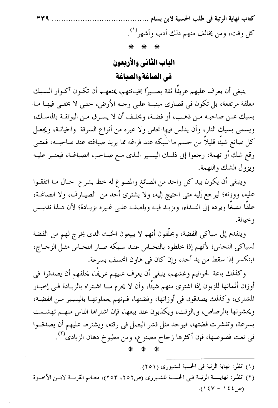 ويتقدم إلى سباكي الفضة، ويحلّفون أنهم لا يبيعون الخبث الذي يخرج لهم من الفضة لسباكي النحاس؛ لأنهم إذا خلطوه بالنحاس عند سبكه صار النحاس مثل الزجاج، فينكسر إذا سقط من يد أ؛ د، وإن كان في هاون انخسف بسرعة.