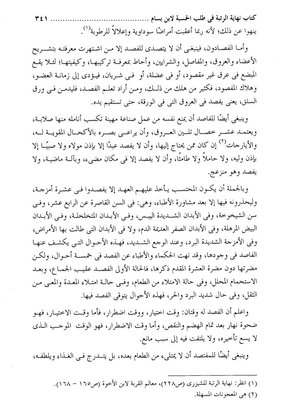 وبالجملة أن يكون المحتسب يأخذ عليهم العهد إلا يفصدوا في عشرة أمزجة، وليحذروا فيها إلا بعد مشاورة الأطباء، وهي: في السن القاصرة عن الرابع عشر، وفي سن الشيخوخة، وفي الأبدان الشديدة اليبس، وفي الأبدان المتخلخلة، وفي الأبدان البيض المرهلة، وفي الأبدان الصفر العديمة الدم، ولا في الأبدان التي طالت بها الأمراض، وفي الأمزجة الشديدة البرد، وعند الوجع الشديد، فهذه الأحوال التي يكشف عنها الفاسد في وجودها، وقد نهت الحكماء والأطباء عن الفصد في خمسة أحوال، ولكن مضرتها دون مضرة العشرة المقدم ذكرها، فالحالة الأولى الفصد عقيب الجماع، وبعد الاستحمام المحلل، وفي حالة الامتلاء من الطعام، وفي حالة امتلاء المعدة والمعى من الثقل، وفي حال شديد البرد والحر، فهذه الأحوال يتوقى الفصد فيها.