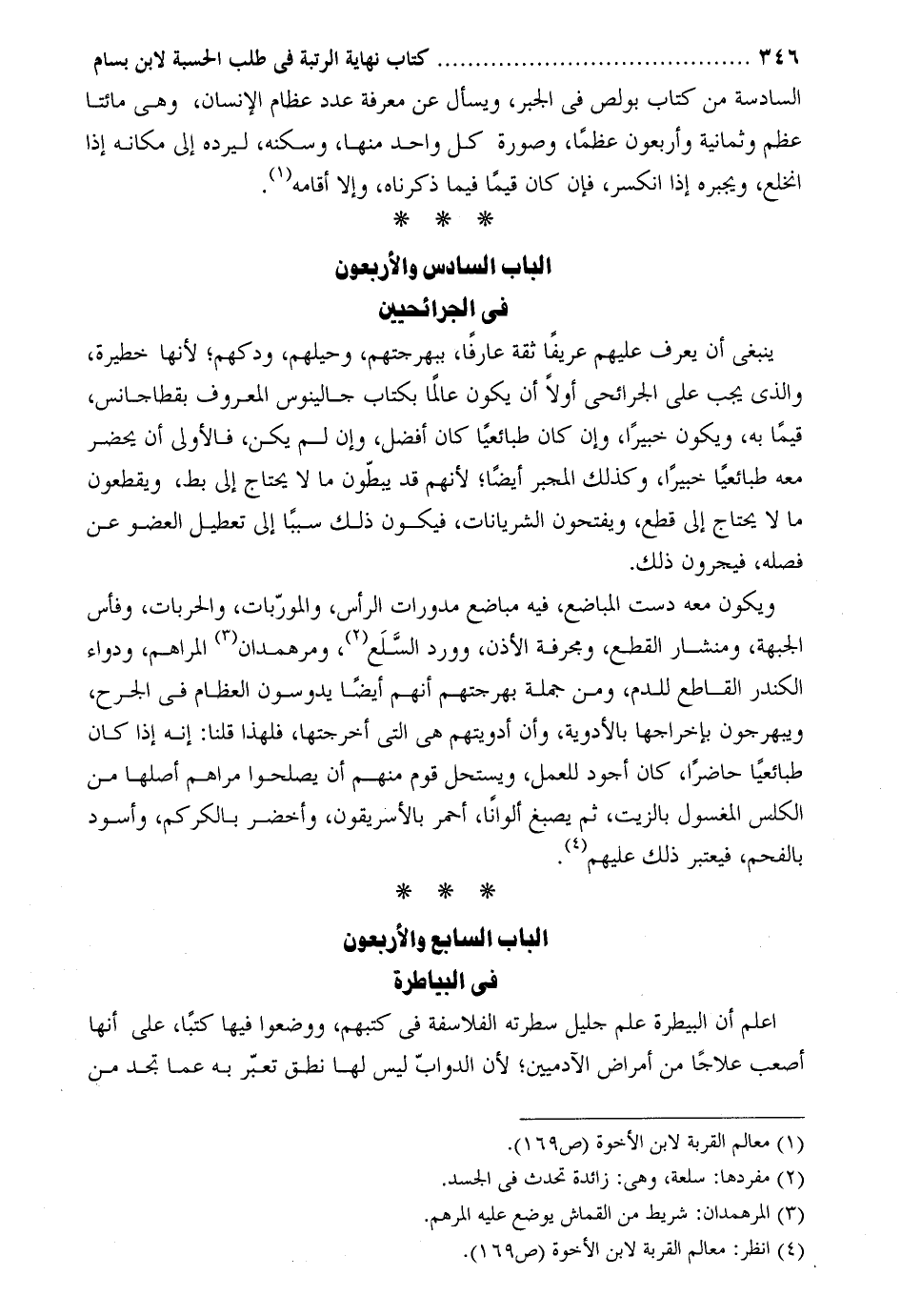 ينبغي أن يعرف عليهم عريفاً ثقة عارفاً، ببهرجتهم، وحيلهم، ودكهم؛ لأنها خطيرة، والذي يجب على الجرائحي اولاً أن يكون عالماً بكتاب جالينوس المعروف بقطاجانس، قيماً به، ويكون خبيراً، وإن كان طبائعياً كان أفضل، وإن لم يكن، فالأولى أن يحضر معه طبائعياً خبيراً، وكذلك المجبر أيضاً؛ لأنهم قد يبطّون ما لا يحتاج إلى بط، ويقطعون ما لا يحتاج إلى قطع، ويفتحون الشريانات، فيكون ذلك سبباً إلى تعطيل العضو عن فصله، فيجرون ذلك.