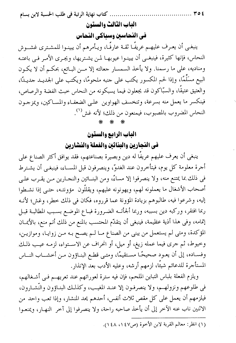ينبغي أن يعرف عليهم عريفاً ثقة عارفاً، ويأمرهم أن يبينوا للمشتري غشوش النحاس، فإنها كثيرة، فينبغي أن يبينوا عيوبها لمن يشتريها، ويجري الأمر في باعته ومناديه، على ما رسمنا. ولا يأخذ السمسار جعالته إلا من البائع، بحكم أن لا يكون البيع مسلماً، وإذا لحم المكسور يكتب على جنبه ملحوماً، ويكتب على الجديد جديداً، والعتيق عتيقاً، والسبّاكون قد يجعلون فيما يسبكونه من النحاس خبث الفضة والرصاص، فينكسر ما يعمل منه بسرعة، وينخسف الهواوين على الضعفاء والمساكين، ويمزجون النحاس المضروب بالمصبوب، فيمنعون من ذلك؛ لأنه غش.