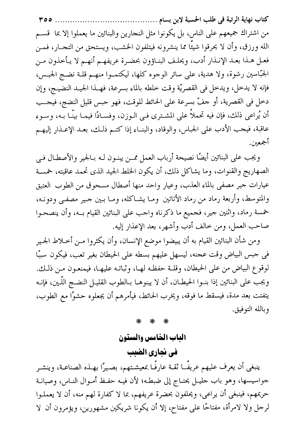 من اشتراك جميعهم على الناس، بل يكونوا مثل النجارين والبنائين ما يعملوا إلا بما قسم الله ورزق، وأن لا يحرقوا شيئاً مما ينشرونه فيتلفون الخشب، ويستحق من التجار، فمن فعل هذا بعد الإنذار أدب، ويحلف البناؤون بحضرة عريفهم أنهم لا يأخذون من الجبّاسين رشوة، ولا هدية، على سائر الوجوه كلها، ليكتموا منهم قلن نضج الجبس، فإنه لا يدخل، ويدخل في القصرية وقت خلطه بالماء بسرعة، فهذا الجيد النضيج، وإن دخل في القصرية، أو جف بسرعة على الحائط للوقت، فهو جبس قليل النضج، فيجب أن يُراعى ذلك، فإن فيه تحملاً على المشتري في الوزن، وفساداً فيما بيّنا به، وسوء عاقبة، فيجب الأدب على الجباس، والوقاد، والبناء إذا كتم ذلك، بعد الإعذار إليهم أجمعين.