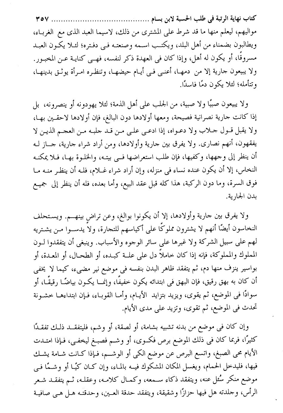 ولا يفرق بين جارية وأولادها، إلا أن يكونوا بوالغ، وعن تراض بينهم. ويستحلف النخاسون أيضاً أنهم لا يشترون مملوكاً على أكياسهم للتجارة، ولا يدسوا من يشتريه لهم على سبيل الشركة ولا غيرها على سائر الوجوه والأسباب. وينبغي أن يتفقدوا لون المملوك والمملوكة، فإنه إذا كان خاملاً دل على علة كبده، أو الطحال، أو المعدة، أو بواسير ينزف منها دم، ثم يتفقد ظاهر البدن بنفسه في موضع نير مضيء، كيما لا يخفى أن كان به بهق رقيق، فإن البهق في ابتدائه يكون خفيفاً، وإنما يكون بياضاً رقيقاً، أو سواداً في الموضع، ثم يقوى، ويزيد بتزايد الأيام، وأما القوباء، فإن ابتداءها خشونة تحث في الموضع، ثم تقوى، وتزيد على مدى الأيام.