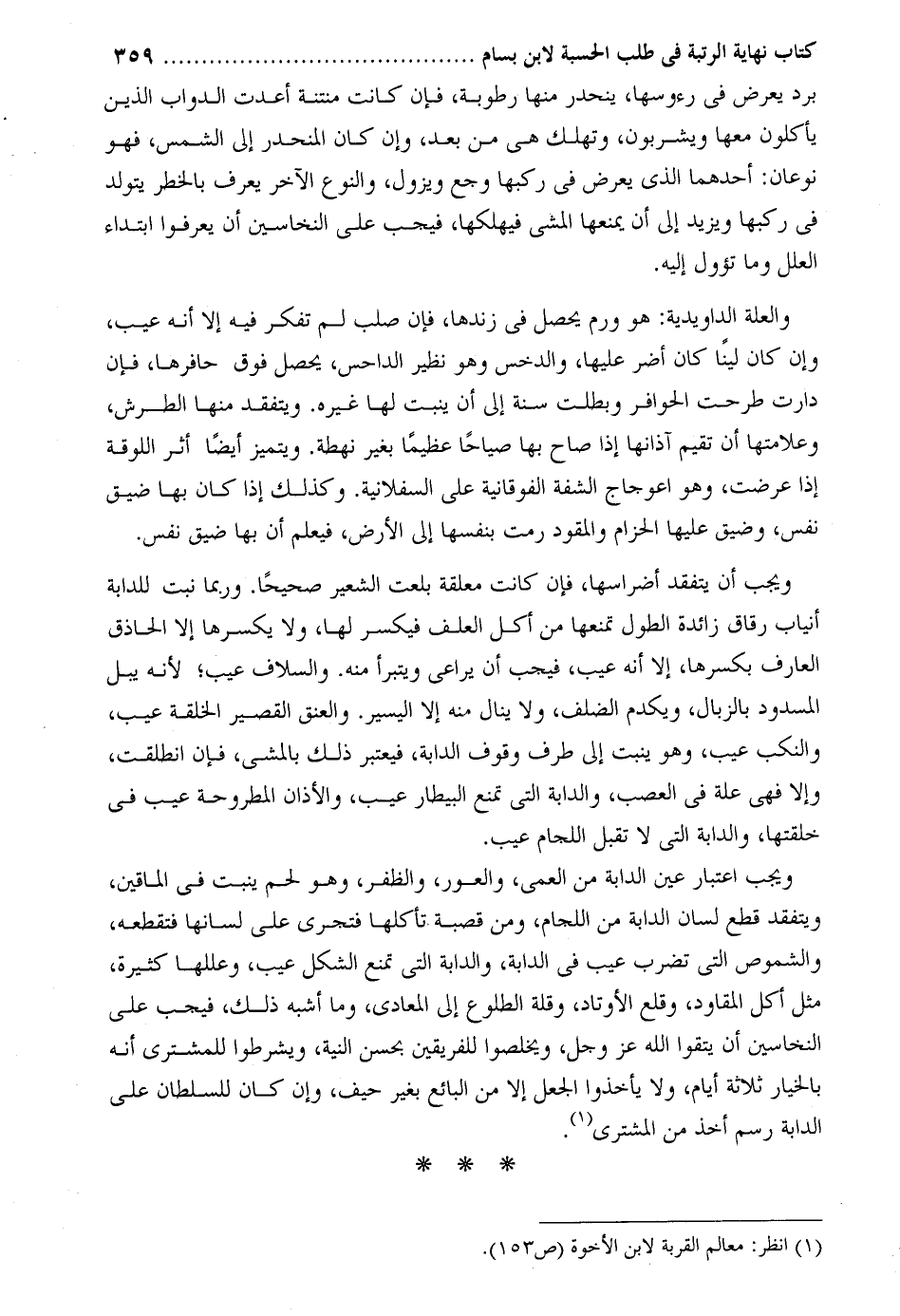 ويجب اعتبار عين الدابة من العمى، والعور، والظفر، وهو لحم ينبت في الماقين، ويتفقد قطع اللسان الدابة من اللحام، وفي قصبة تأكلها فتجرى على لسانها فتقطعه، والشموص التي تضرب عيب من الدابة، والدابة التي تمنع الشكل عيب، وعللها كثيرة مثل أكل المقاود، وقلع الأوتاد، وقلة الطلوع إلى المعادن، وما أشبه ذلك، فيجب على النخاسين أن يتقوا الله عز وجل، ويخلصوا للفريقين بحسن النية، ويشرطوا للمشتري أنه بالخيار ثلاثة أيام، ولا يأخذوا الجعل إلا من البائع بغير حيف، وإن كان للسلطان على الدابة رسم أخذ من المشتري.
