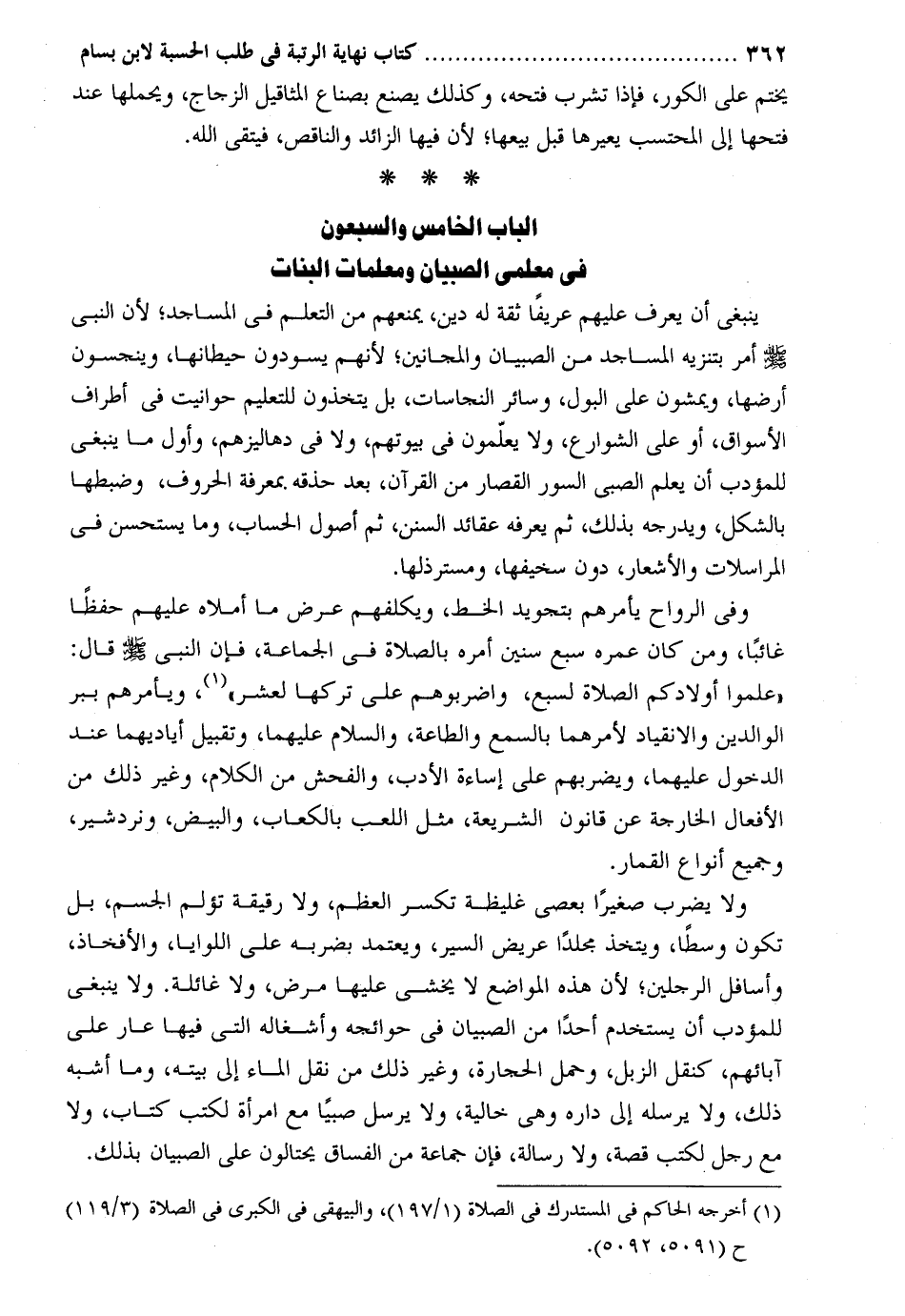 وفي الرواح يأمرهم بتجويد الخط، ويكلفهم عرض ما أملاه عليهم حفظاً غائباً، ومن كان عمره سبع سنين أمره بالصلاة في الجماعة، فإن النبي صلى الله عليه وسلم قال: "علموا أولادكم الصلاة لسبع، واضربوهم على تركها لعشر"، ويأمرهم ببر الوالدين والانقياد لأمرهما بالسمع والطاعة، والسلام عليهما، وتقبيل أياديهما عند الدخول عليهما، ويضربهم على إساءة الأدب، والفحش من الكلام، وغير ذلك من الأفعال الخارجية عن قانون الشريعة، مثل اللعب بالكعاب، والبيض، ونردشير، وجميع أنواع القمار.