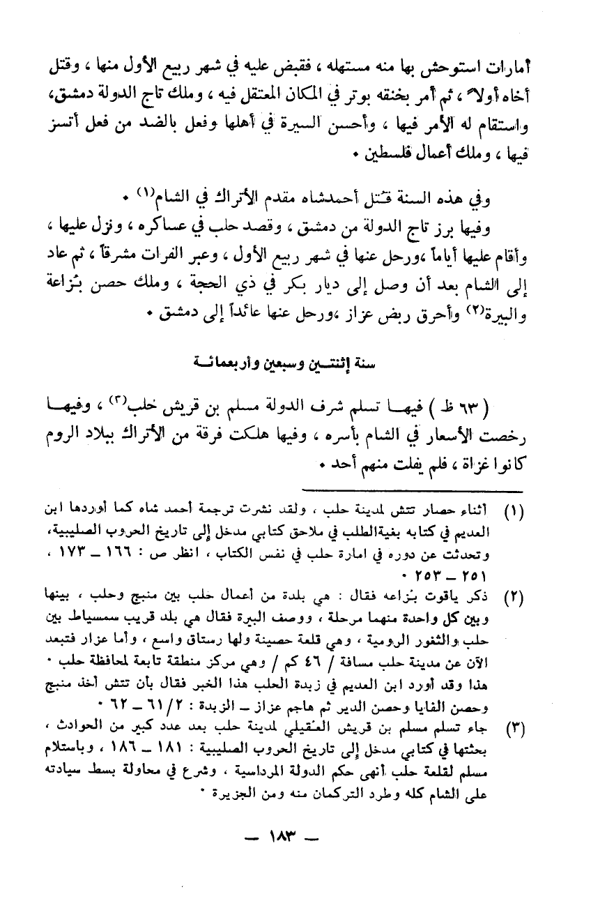 أمارات استوحش بها منه متسهله كذا فقبض عليه في شهر ربيع الأول منها وقتل أخاه أولاً ثم أمر بخنقه فخنق بوتر في المكان المعتقل فيه وملك تاج الدولة دمشق واستقام له الأمر فيها وأحسن السيرة في أهلها وفعل بالضد من فعل اتسز فيها وملك أعمال فلسطين. وفي هذه السنة قتل أحمد شاه مقدم الأتراك في الشام. وفيها برز تاج الدولة من دمشق وقصد حلب في عسكره ونزل عليها وأقام عليها أياماً ورحل عنها في شهر ربيع الأول وعبر الفرات مشرقاً ثم عاد إلى الشام بعد أن وصل إلى ديار بكر في ذي الحجة وملك حصن بزاعة والبيرة وأحرق ربض عزاز ورحل عنها عائداً إلى دمشق