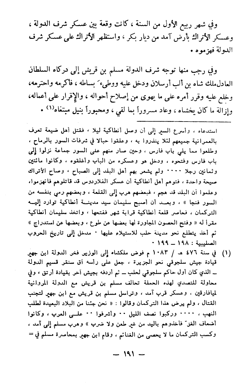 وفي شهر ربيع الأول من السنة كانت وقعة بين عسكر شرف الدولة وعسكر الأتراك بأرض آمد من ديار بكر واستظهر الأتراك على عسكر شرف الدولة فهزموه. وفي رجب منها توجه شرف الدولة مسلم بن قريش إلى دركاه السلطان العادل ملك شاه بن البارسلان ودخل عليه ووطئ بساطه فأكرمه واحترمه وخلع عليه وقرر أمره على ما يهوى من اصلاح أحواله والاقرار على أعماله وإزالة ما كان يخشاه وعاد مسروراً بما لقي ومحبوراً بنيل مبتغاه