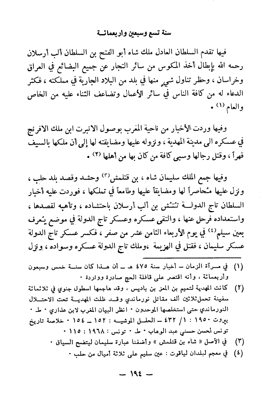 فيها تقدم السلطان العادل ملك شاه أبو الفتح بن السلطان البارسلان رحمه الله بابطال أخذ المكوس من سائر التجار عن جميع البضائع في العراق وخراسان وحظر تناول شيء منها في بلد من البلاد الجارية في مملكته فكثر الدعاء له من كافة الناس في سائر الأعمال وتضاعف الثناء عليه من الخاص والعام. وفيها وردت الأخبار من ناحية المغرب بوصول الانبرت ابن ملك الافرنج في عسكره إلى مدينة المهدية ونزوله عليها ومضايقته لها إلى أن ملكها بالسيف قهراً وقتل رجالها وسبى كافة من كان بها من أهلها. وفيها جمع الملك سليمان بن قتلمش وحشد وقصد بلد حلب ونزل عليها محاصراً لها ومضايقاً عليها وطامعاً في تملكها فوردت عليه أخبار السلطان تاج الدولة تتش بن البارسلان باحتشاده وتأهبه لقصدها واستعداده فرحل عنها والتقى عسكره وعسكر تاج الدولة في موضع يعرف بعين سلم في يوم الأربعاء الثامن عشر من صفر فكسر عسكر تاج الدولة عسكر سليمان فقتل في الهزيمة وملك تاج الدولة عسكره وسواده ونزل