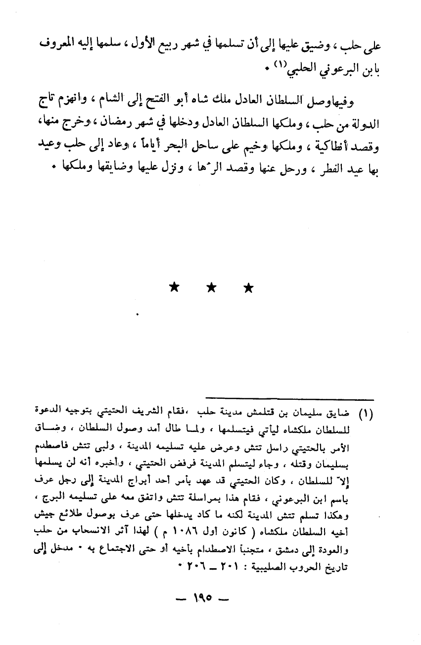 على حلب وضيق عليها إلى أن تسلمها في شهر ربيع الأول سلمها إليه المعروف بابن اليرعوني الحلبي. وفيها وصل السلطان العادل ملك شاه أبو الفتح إلى الشام وانهزم تاج الدولة من حلب وملكها السلطان العادل ودخلها في شهر رمضان وخرج منها وقصد انطاكية وملكها وخيم على ساحل البحر أياماً وعاد إلى حلب وعيد بها عيد الفطر ورحل عنها وقصد الرها ونزل عليها وضايقها وملكها