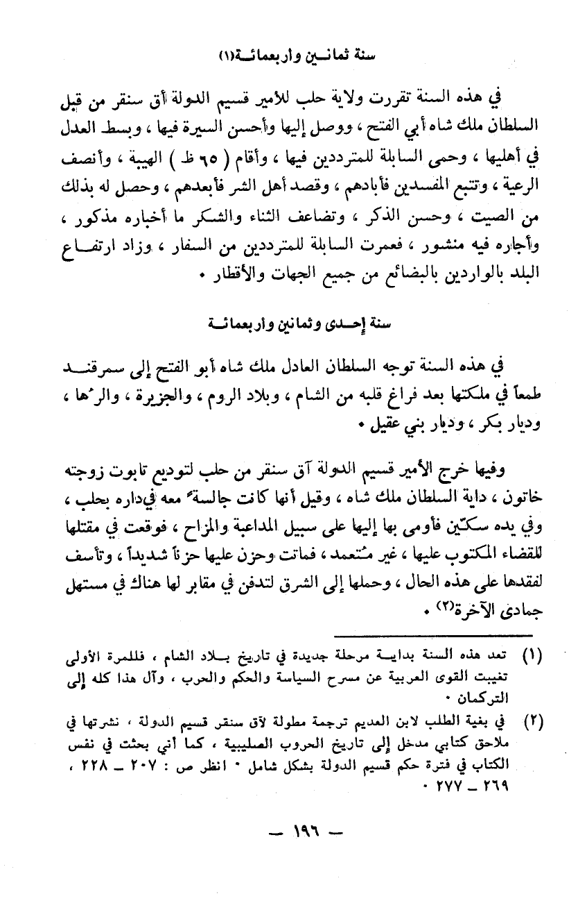في هذه السنة تقررت ولاية حلب للأمير قسيم الدولة اق سنقر من قبل السلطان ملك شاه أبي الفتح ووصل إليها وأحسن السيرة فيها وبسط العدل في أهليها وحمى السابلة للمترددين فيها وأقام الهيبة وانصف الرعية وتتبع المفسدين فأبادهم وقصد أهل الشر فأبعدهم وحصل له بذلك من الصيت وحسن الذكر وتضاعف الثناء والشكر ما إخباره مذكور واجاره فيه منشور فعمرت السابلة للمترددين من السفار وزاد ارتفاع بالبلد بالواردين بالبضائع من جميع الجهات والأقطار