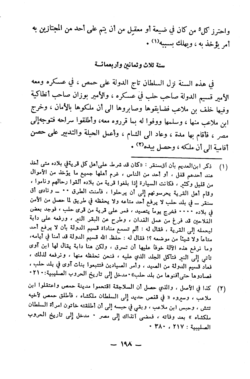 في هذه السنة نزل السلطان تاج الدولة على حمص في عسكره ومعه الأمير قسيم الدولة صاحب حلب في عسكره والأمير بوزان صاحب انطاكية وفيها خلف ابن ملاعب فضايقوها وصابروها إلى أن ملكوها بالأمان وخرج ابن ملاعب منها وسلمها ووفوا له بما قرروه معه واطلقوا سراحه فتوجه إلى مصر فأقام بها مدة وعاد إلى الشام واعمل الحيلة والتدبير على حصن أفامية إلى أن ملكه وحصل بيده