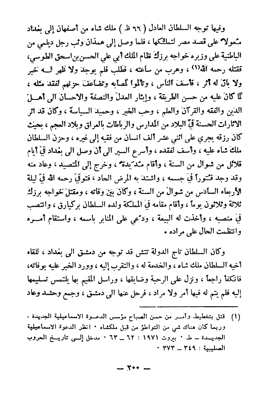 وفيها توجه السلطان العادل ملك شاه من أصفهان إلى بغداد معولاً على قصد مصر لتملكها فلما وصل إلى همذان وثب رجل ديلمي من الباطنية على وزيره خواجه بزرك نظام الملك أبي علي الحسن بن إسحق الطوسي فقتله رحمه الله وهرب من ساعته فطلب فلم يوجد ولا ظهر له خبر ولا بان له أثر فأسف الناس وتألموا لمصابه وتضاعف حزنهم لفقد مثله لما كان عليه من حسن الطريقة وآثار العدل والنصفة والاحسان إلى أهل الدين والفقه والقرآن والعلم وحب الخير وحميد السياسة وكان قد آثر الاثارات الحسنة في البلاد من المدارس والرباطات بالعراق وبلاد العجم بحيث كان رزقه يجري على اثني عشر ألف إنسان من فقيه إلى غيره. وحزن السلطان ملك شاه عليه وأسف لفقده وأسرع السير إلى أن وصل إلى بغداد في أيام قلائل من شوال من السنة وقام مديدةً وخرج إلى المتصيد وعاد منه وقد وجد فتوراً في جسمه واشتد به المرض الحاد فتوفي رحمه الله في ليلة الأربعاء السادس من شوال من السنة وكان بين وفاته ومقتل خواجه بزرك ثلاثة وثلاثون يوماً وأقام مقامه في المملكة ولده السلطان بركيارق وانتصب في منصبه وأخذت له البيعة ودعي على المنابر باسمه واستقام أمره وانتظمت الحال على مراده. وكان السلطان تاج الدولة تتش قد توجه من دمشق إلى بغداد للقاء أخيه السلطان ملك شاه والخدمة له والتقرب إليه وورد الخبر عليه بوفاته فانكفأ راجعاً ونزل على الرحبة وضايقها وأرسل المقيم بها يلتمس تسليمها إليه فلم يتم له فيها أمر ولا مراد فرحل عنها إلى دمشق وجمع وحشد وعاد