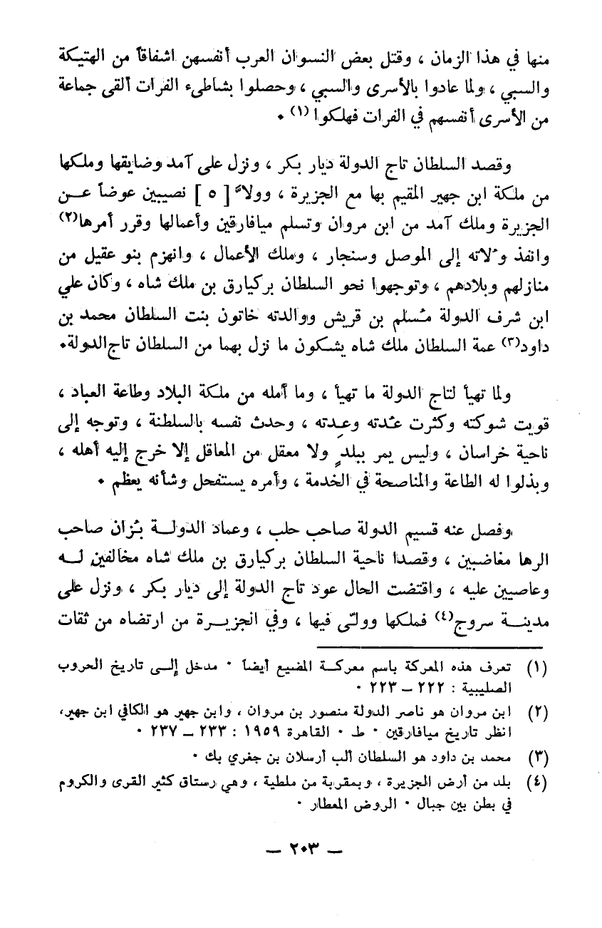 منها في هذا الزمان وقتل بعض نسوان العرب أنفسهن اشفاقاً من الهتيكة والسبي. ولما عادوا بالأسرى والسبي وحصلوا بشاطي الفرات ألقى جماعة من الأسرى أنفسهم في الفرات فهلكوا وقصد السلطان تاج الدولة ديار بكر ونزل على آمد وضايقها وملكها من ملكة ابن جهير المقيم بها مع الجزيرة وولاه نصيبين عوضاً عن الجزيرة وملك آمد من ابن مروان وتسلم ميافارقين وأعمالها وقرر أمرها وأنفذ ولاته إلى الموصل وسنجار وملك الأعمال وانهزم بنو عقيل من منازلهم وبلادهم وتوجهوا نحو السلطان بركيارق بن ملك شاه وكان علي بن شرف الدولة مسلم بن قريش ووالدته خاتون بنت السلطان محمد ابن داود كذا عمة السلطان ملك شاه يشكون ما نزل به من السلطان تاج الدولة